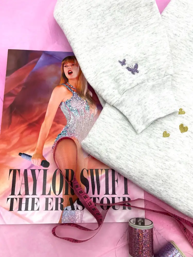 This one of a kind (my design) embroidered medweight sweatshirt features everything Lover Era using only high quality holographic, metallic and rayon thread to make you shimmer ✨ The sleeves are also embroidered with butterflies and a heart complementing the front design which includes the arc, dice and the iconic Lover Bodysuit with the pink Lover guitar 🩷 Made with lots of love in Maple Ridge, BC. Free Local pickup is available if you wish. Turnaround time is 5-10 business days. If you would like another colour, please message me and we can customise it.