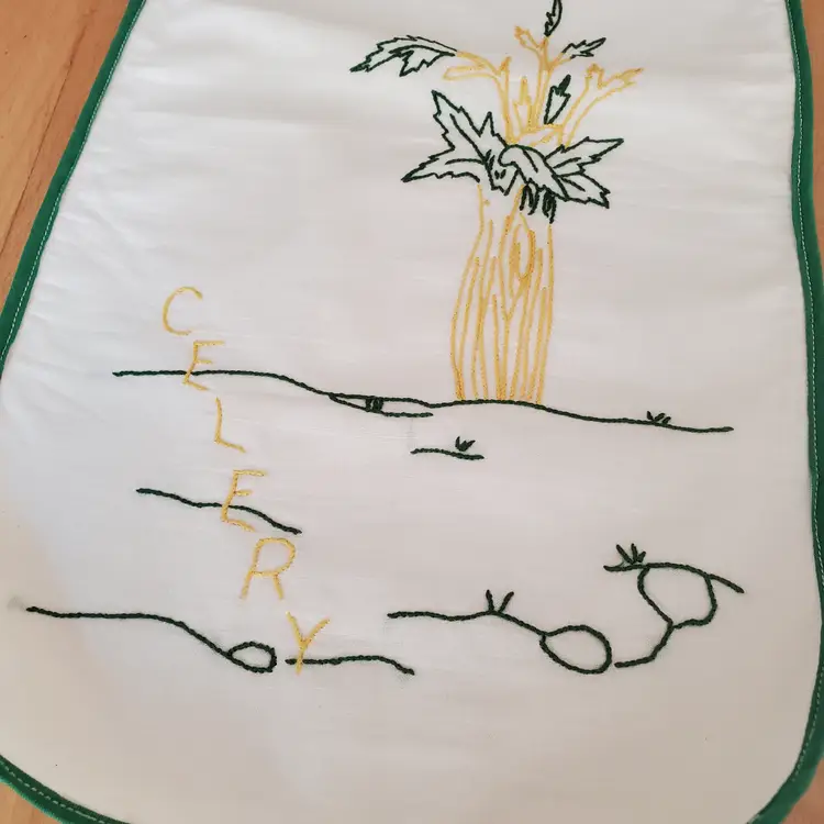 This is an adorable produce bag, embroidered with celery. Use it to keep your veggies crisp or as a cute decorative kitchen accessory. 16.5" x 9". No stains, holes or rips.