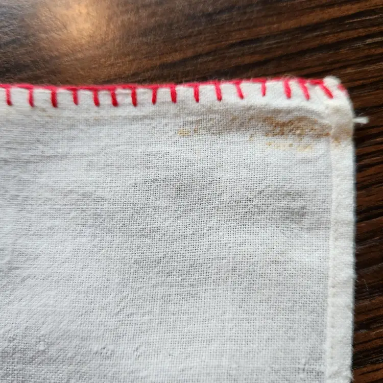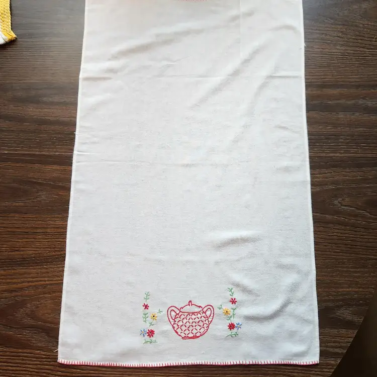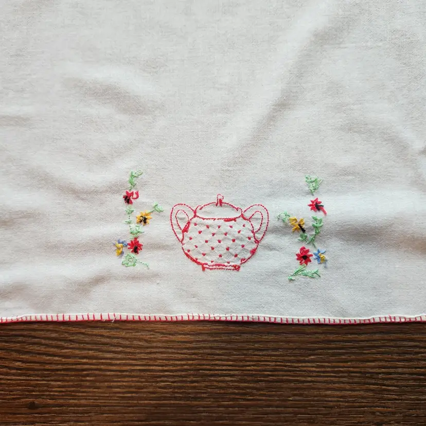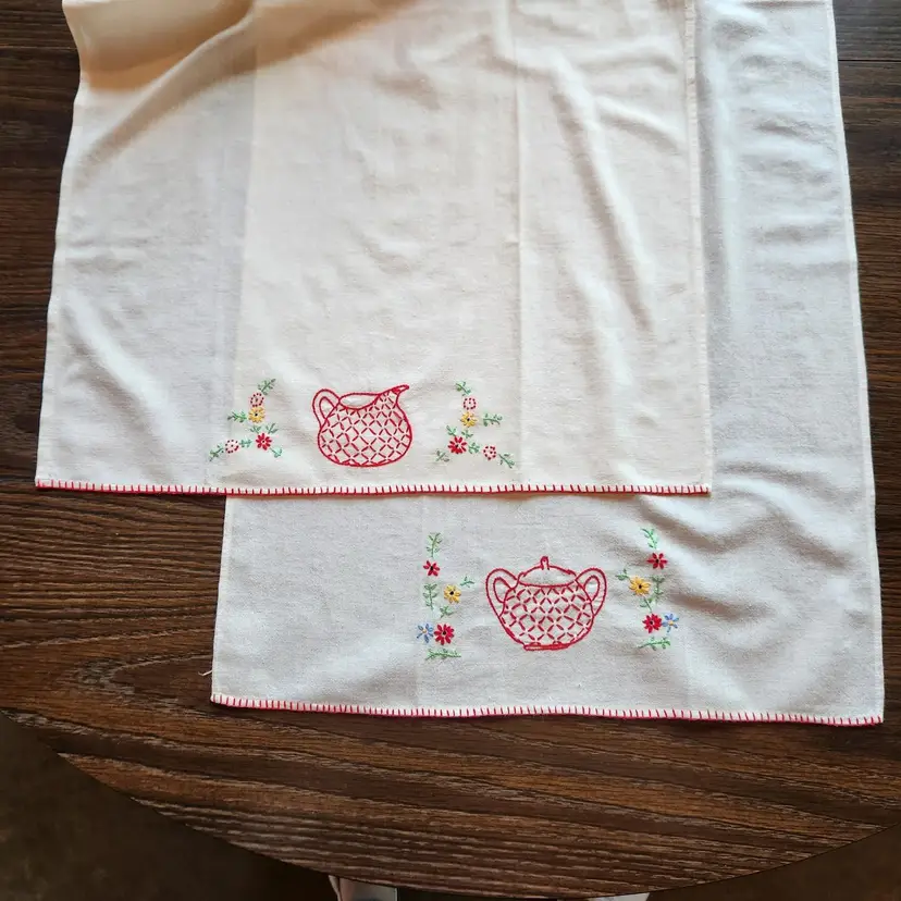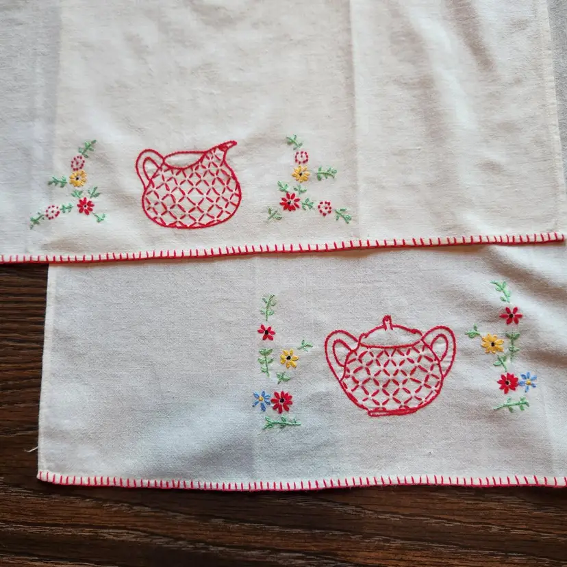 Free US shipping on this item. Vintage estate item from the home of an accomplished seamstress. I don't know what the fabric is but it feels like medium weight cotton to me. Embroidered red creamer & covered sugar with a blanket stitch border. Use as a kitchen towels or as a guest / hand towel in the bath. These are wide enough that they could be folded in half and made into a pillow as well.