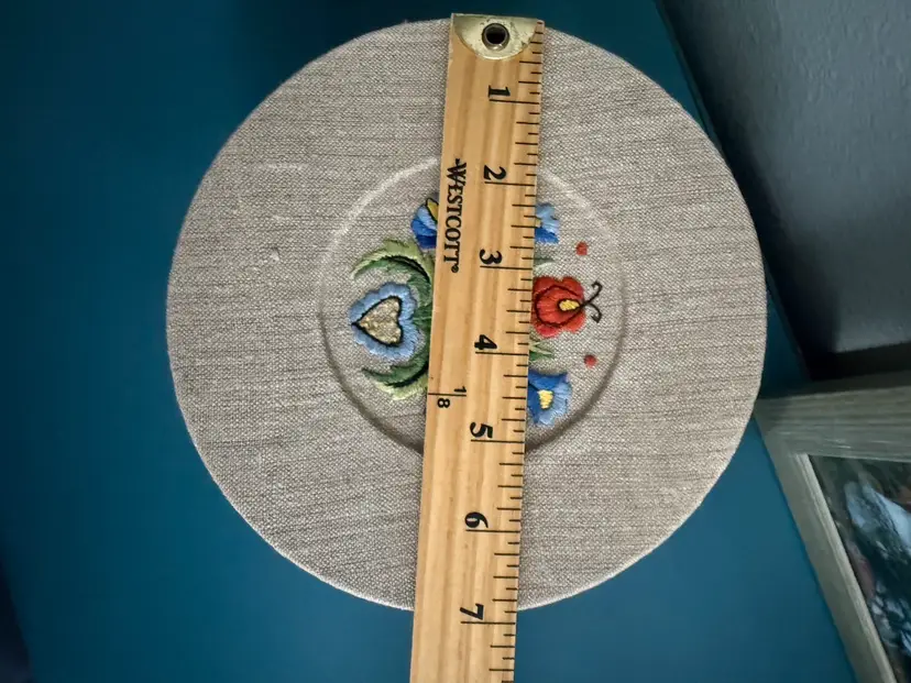 The piece on the box is stitched on a woven linen using various embroidery stitches to create a distinct floral. Excellent preowned condition, like new. Great for storing small items like jewelry, keepsakes, sewing supplies, TV remotes, medication, anything your heart desires.