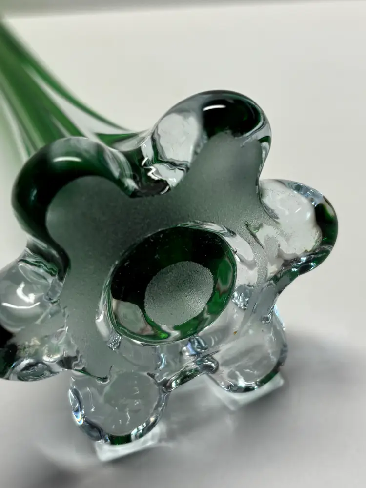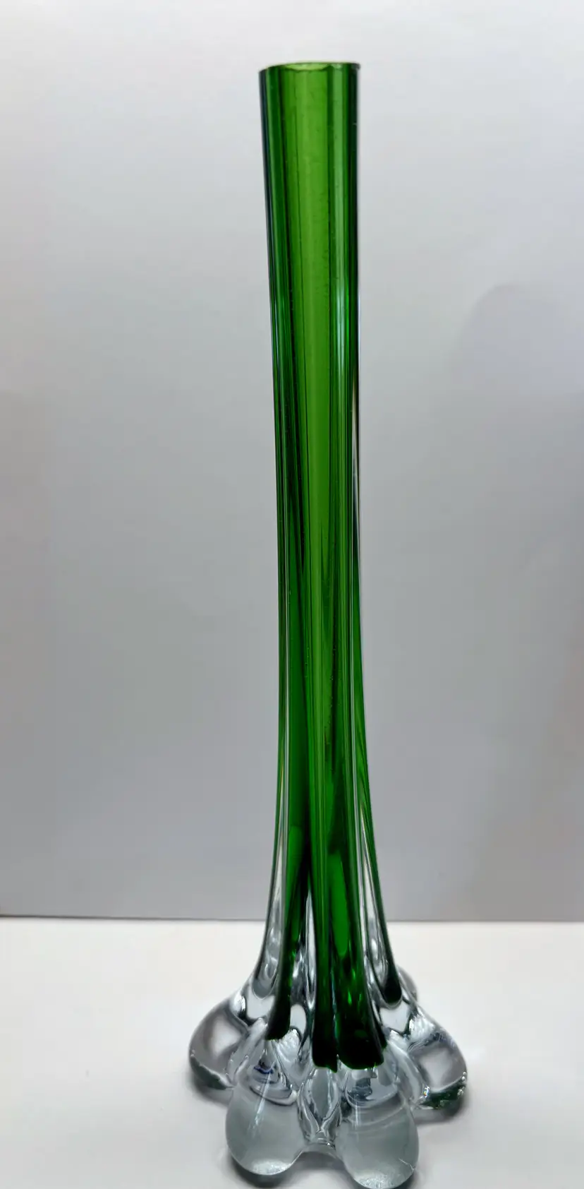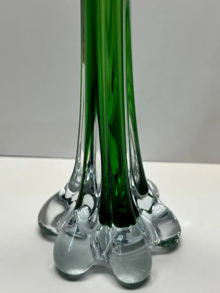 Cute 8" tall Stem Bud Vase Beautiful Emerald Green Possibly hand blown Elephant style base or footing No chips or cracks Perfect to add color to any window or Spring décor or St. Patty's Day