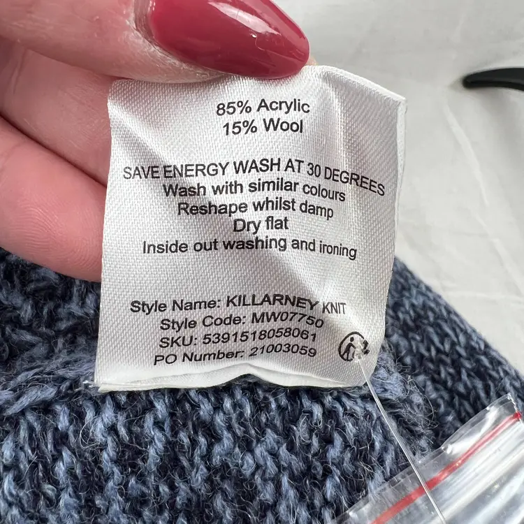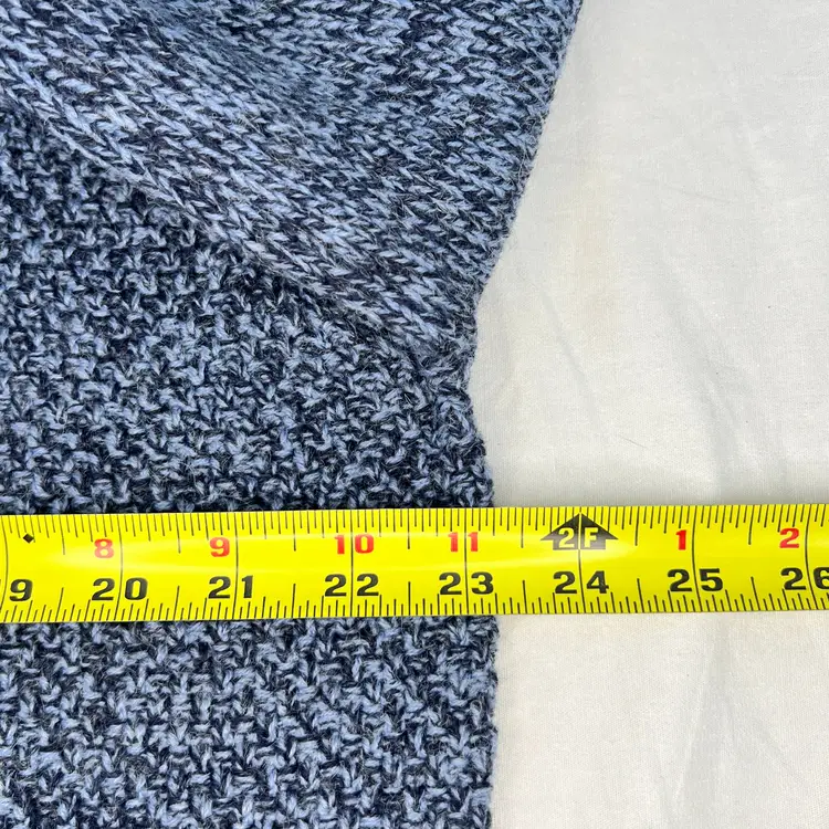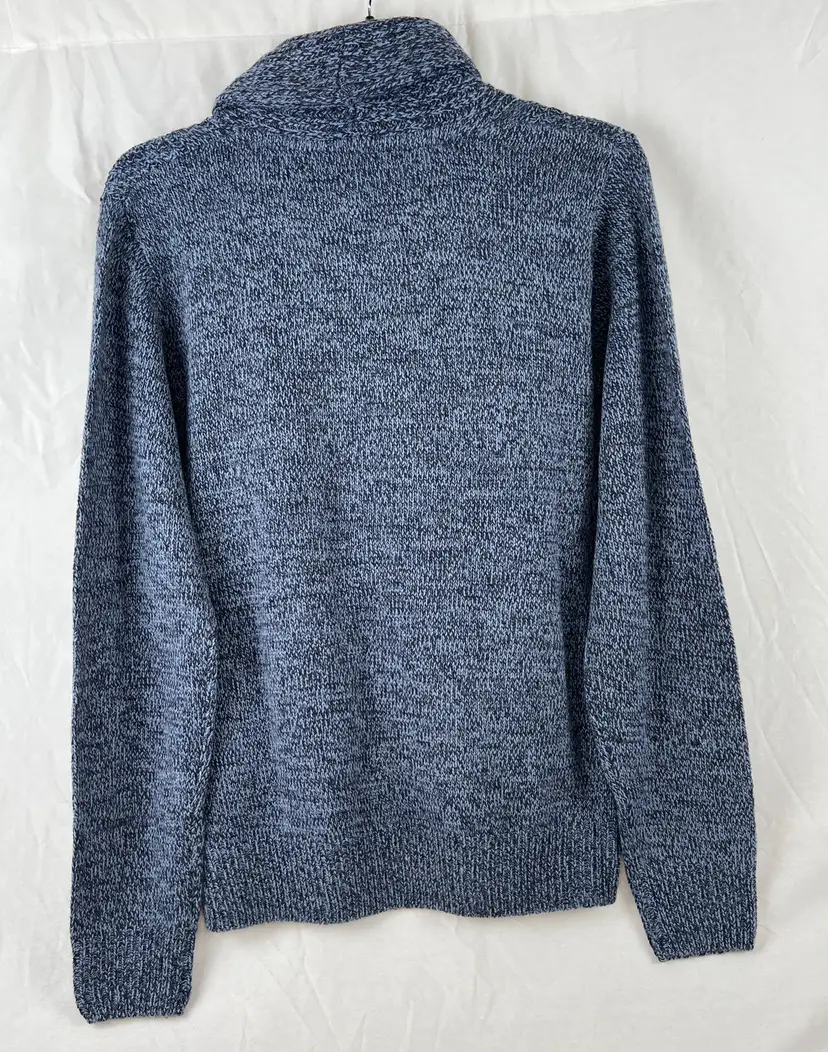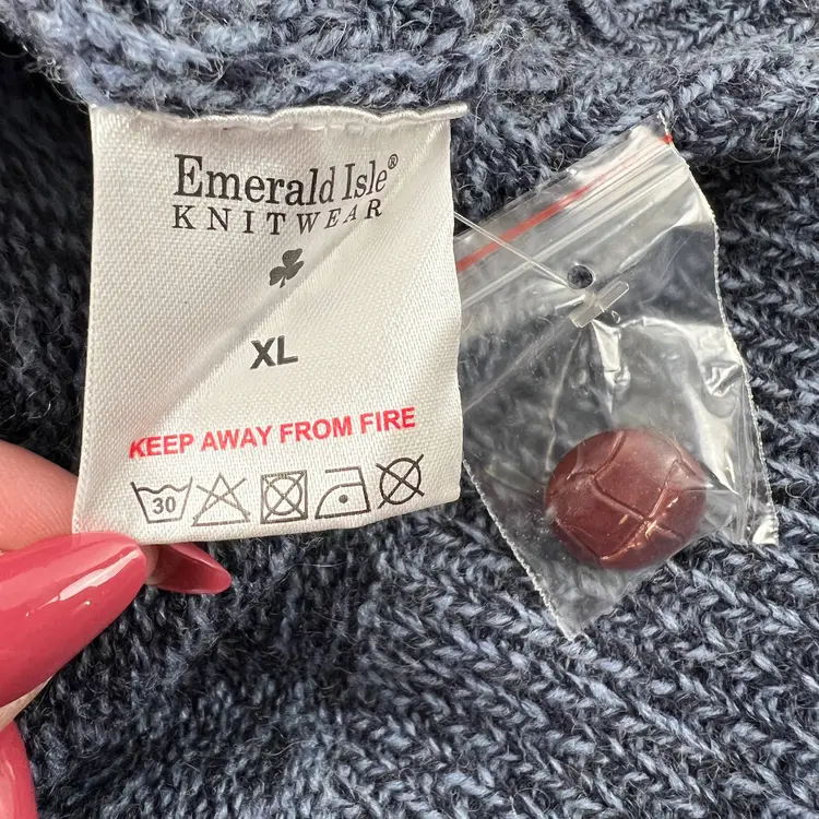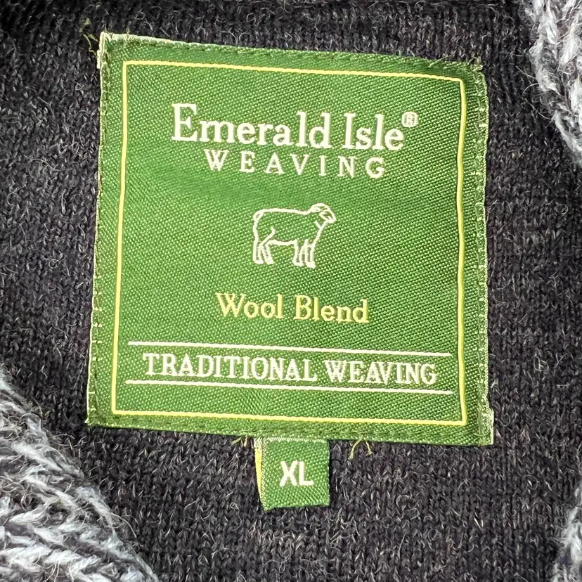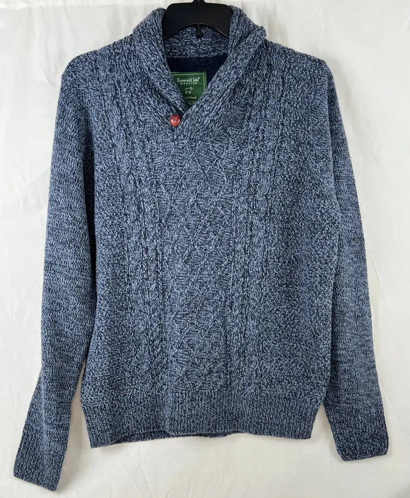 ✨ Details: Wool blend knit Shawl collar neckline with button detail Traditional cable knit pattern Long sleeves Size XL Rich blue heathered tone Emerald Isle Weaving “Traditional Weaving” label