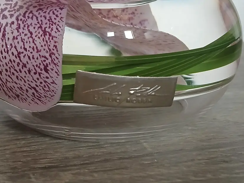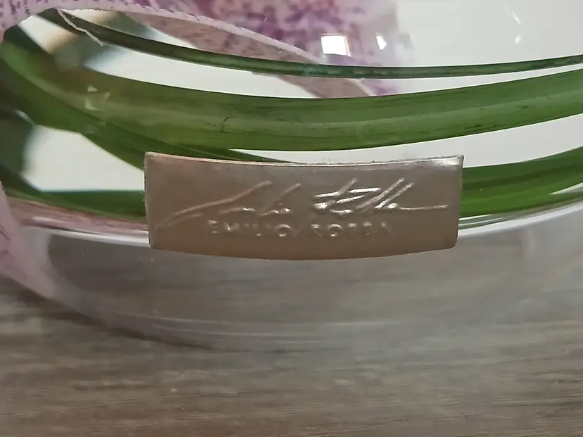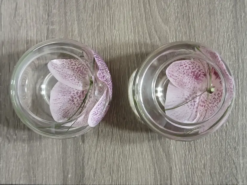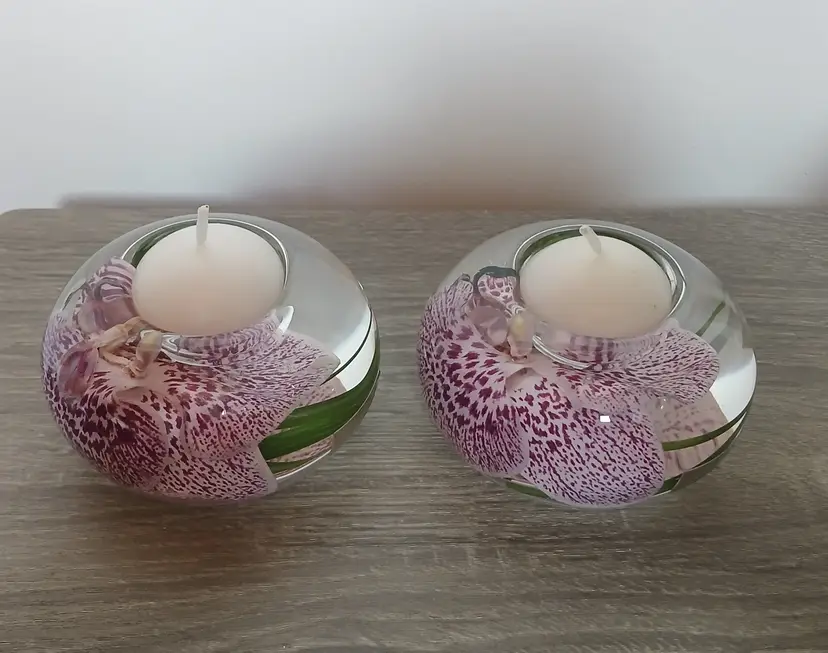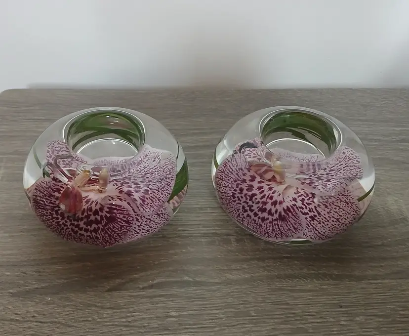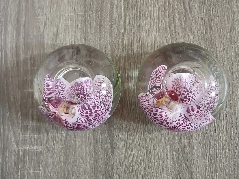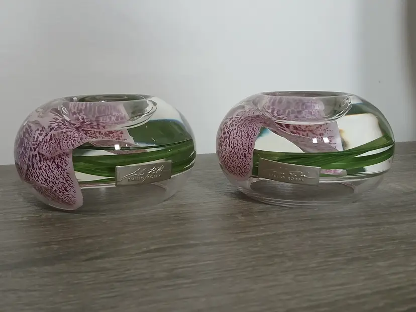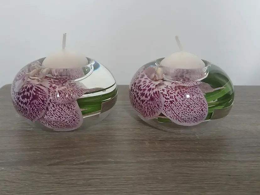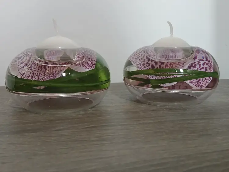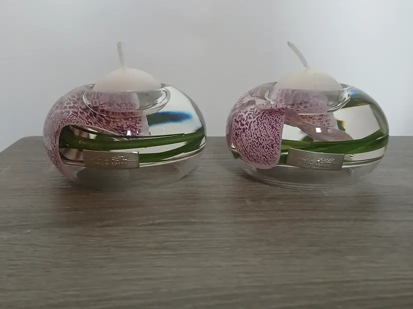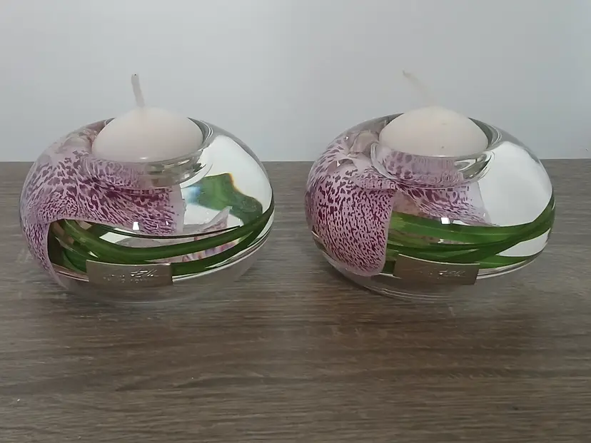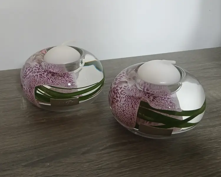 Beautiful set of 2 Emilio Robba purple phalaenopsis orchid flower t-light candle holders. Glass t-light candle holders filled with faux orchids, green glass and their exclusive Illusion Water. Crystal clear design creates the 3D illusion of a flower in water. Designed in France and crafted in the USA. Each candleholder features a silver tone logo plaque. Includes 2 white candles as shown. Tea light holders appear to be unused and in excellent pre-owned condition. Measures approximately 4.5" in diameter x 2.5" high.