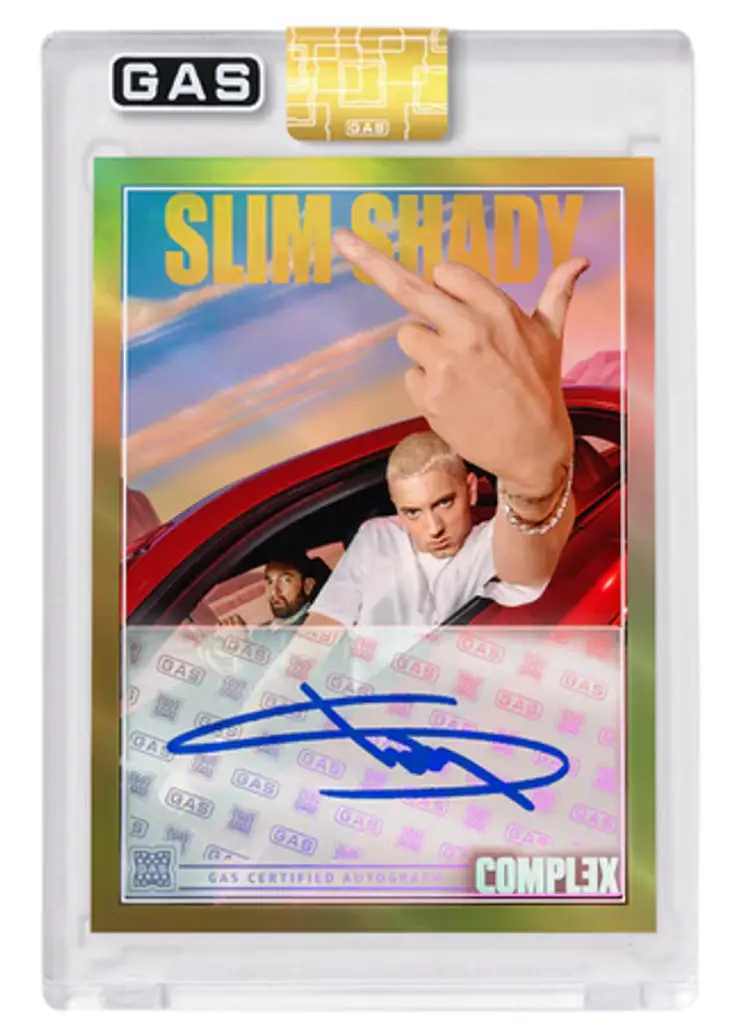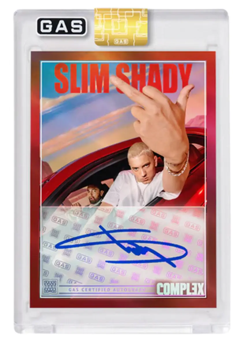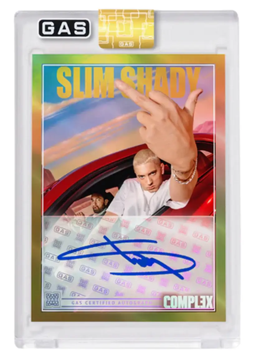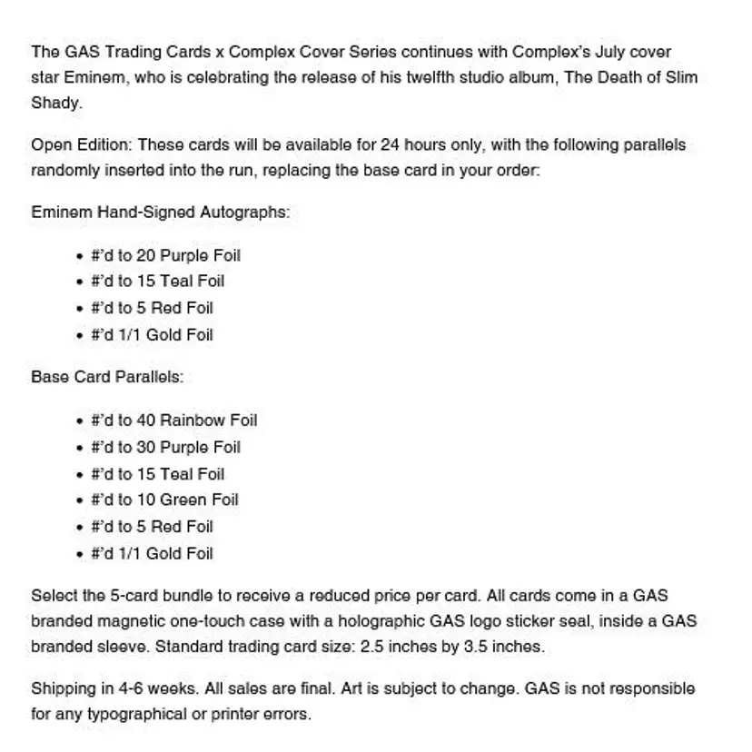 We have purchased 100 of the Slim Shady Complex x Gas Trading cards. We will open these live on youtube & twitter; and if we hit any of the parallels and/or autos in our 100 cards, we will random them off to the participants in this break. Parallels and autos replace a base card if they show up in our order. These are sold out but I haven't seen an announcement on print run yet. We are hoping to have these in hand within 4-6 weeks. They were originally on the website for $20 each or 5 for $80 with some pretty high shipping costs.