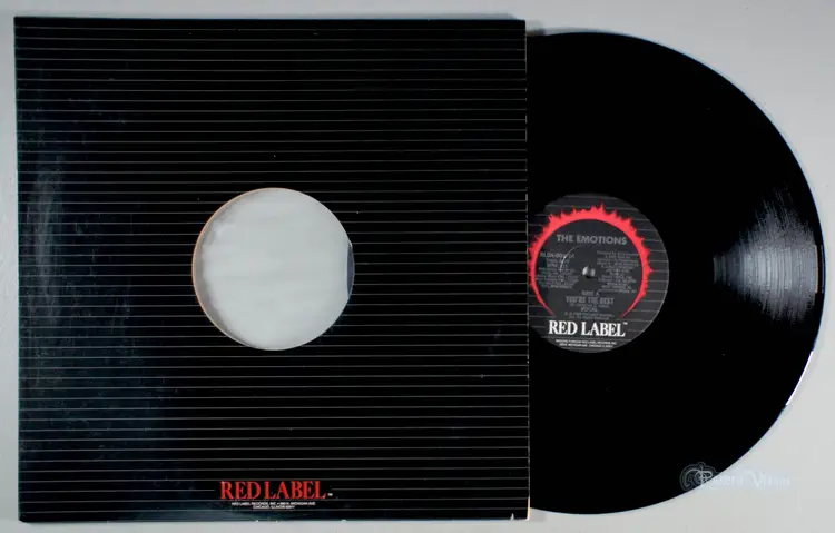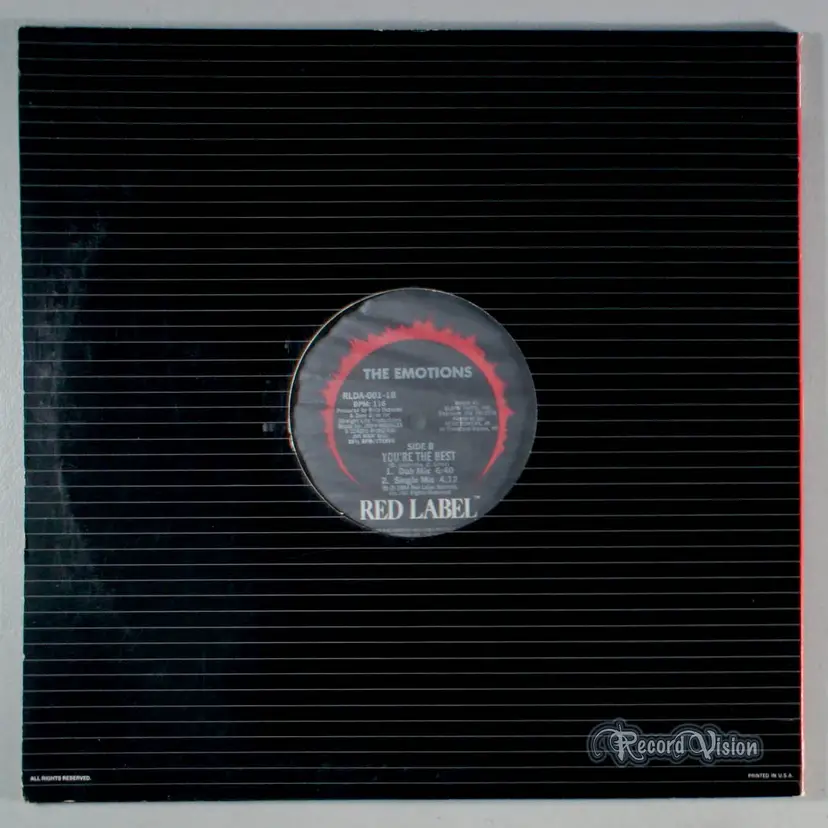 Vinyl plays nicely (play-graded). 12" Single. Generic "Red Label" cover looks good, moderate scuffing and tiny surface abrasions (front/back); front has small surface impression near bottom right. Inner-sleeve is original (plastic). Spine is easy-to-read with wear. Shelf-wear along top/bottom-edge and corners; developing split at bottom center. Opening is crisp with signs of light use and divots. (Not a cut-out.)