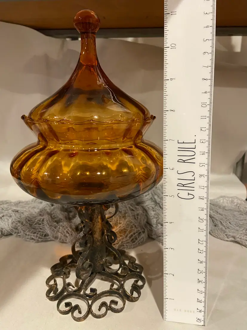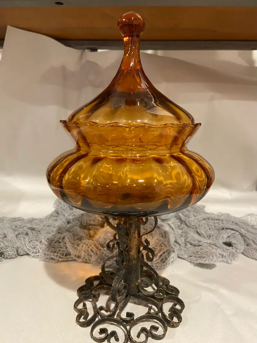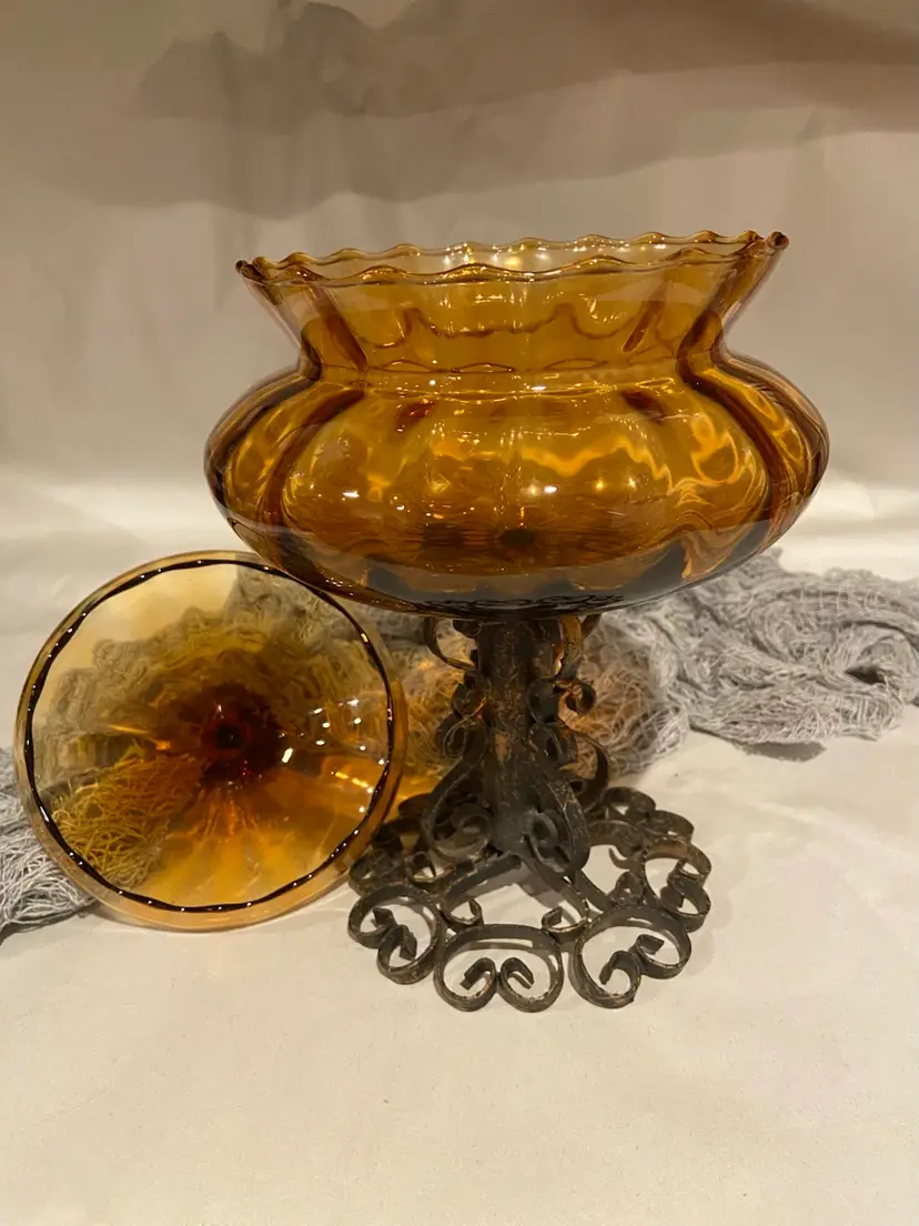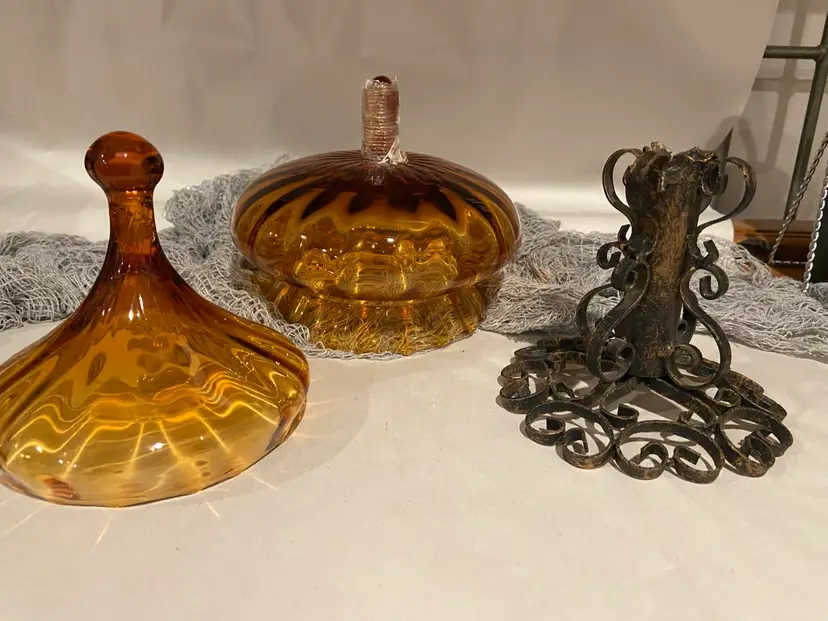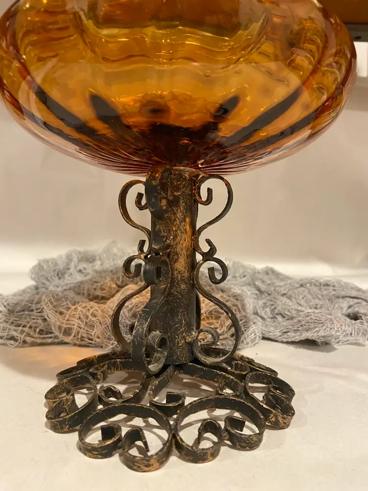 At first, I thought maybe the original glass vase had been damaged and someone MacGyver’d a fix with the base. Inspection reveals this base is by design, as the base of the bottom art glass piece is finished to a smooth end and wrapped with material to sit safely and hold steady in the wrought iron base.