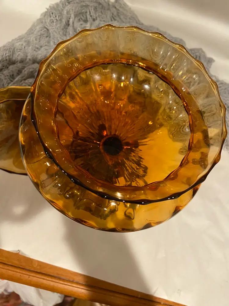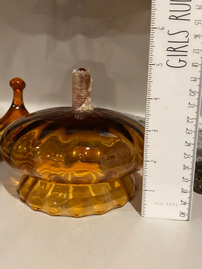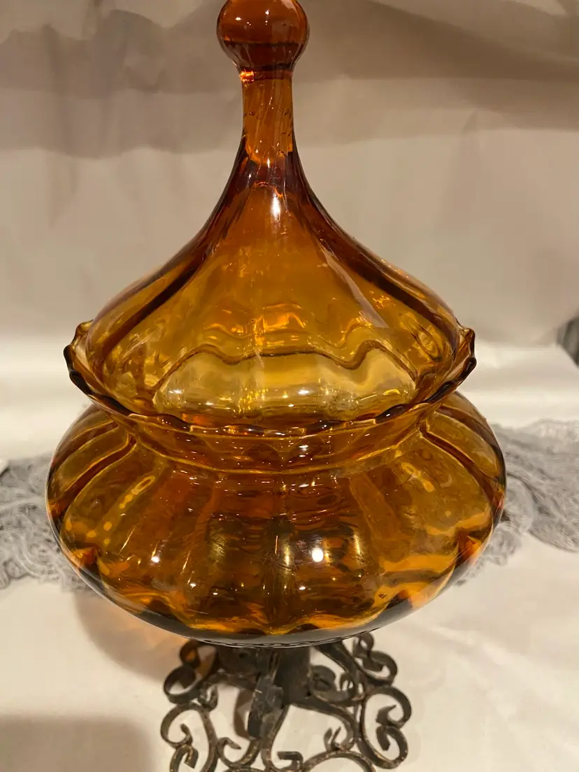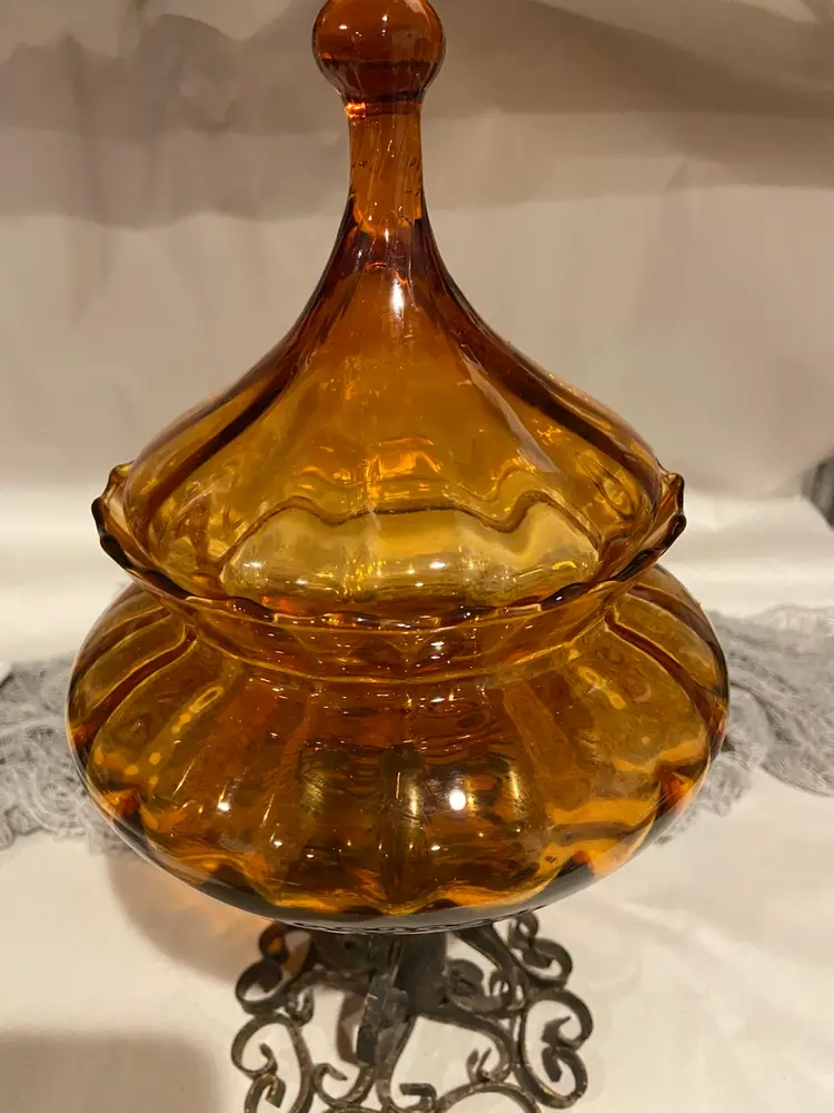 At first, I thought maybe the original glass vase had been damaged and someone MacGyver’d a fix with the base. Inspection reveals this base is by design, as the base of the bottom art glass piece is finished to a smooth end and wrapped with material to sit safely and hold steady in the wrought iron base.