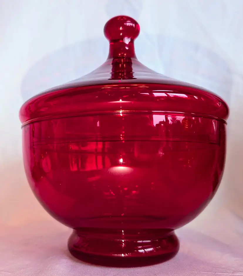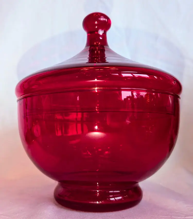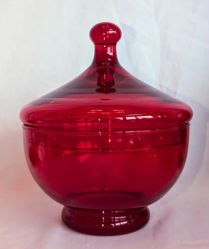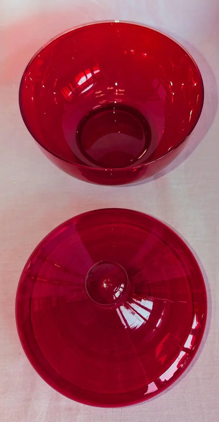 Stunning red and does have amberina glow. Excellent Used Condition. No chips or cracks. 6.75" wide diameter x 8" high including lid.