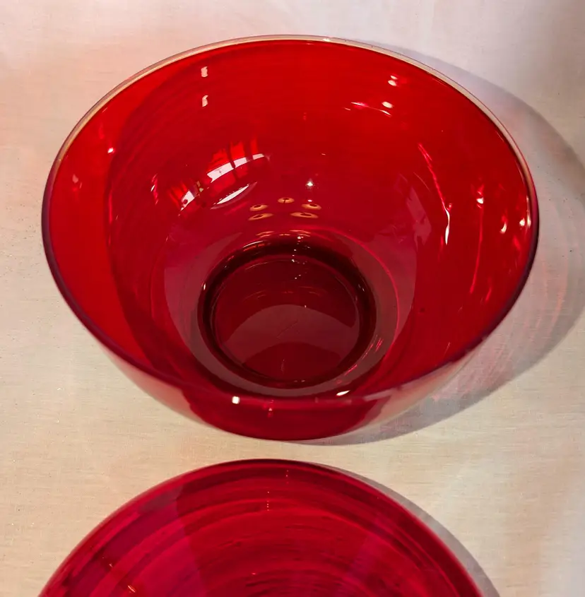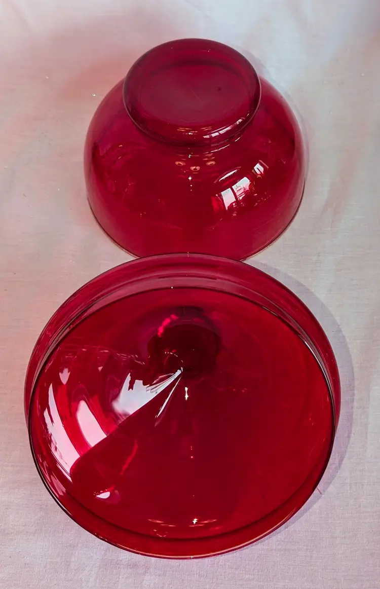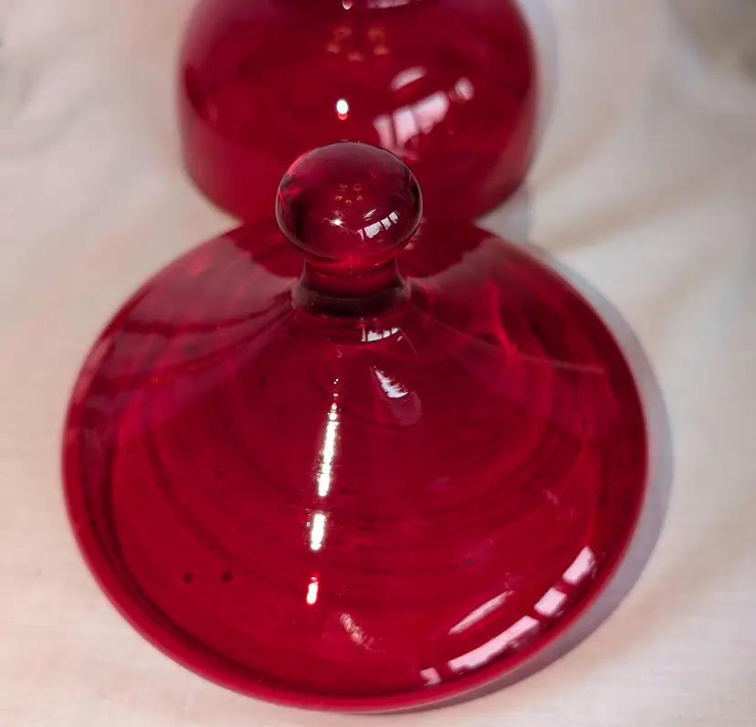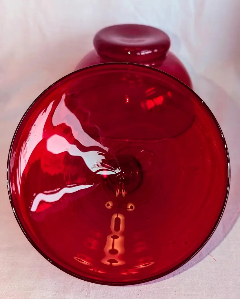 Stunning red and does have amberina glow. Excellent Used Condition. No chips or cracks. 6.75" wide diameter x 8" high including lid.