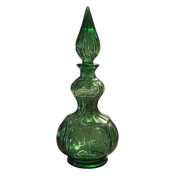 Introducing the Empoli Italy Emerald Green Glass Genie Bottle Corset Decanterβa stunning piece of glass artistry that will elevate your home decor. Crafted in the heart of Italy, this exquisite decanter features a unique corset shape and a rich emerald green hue, making it a standout addition to any collection.