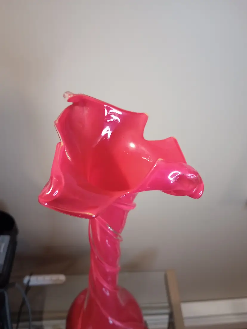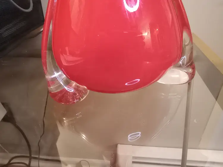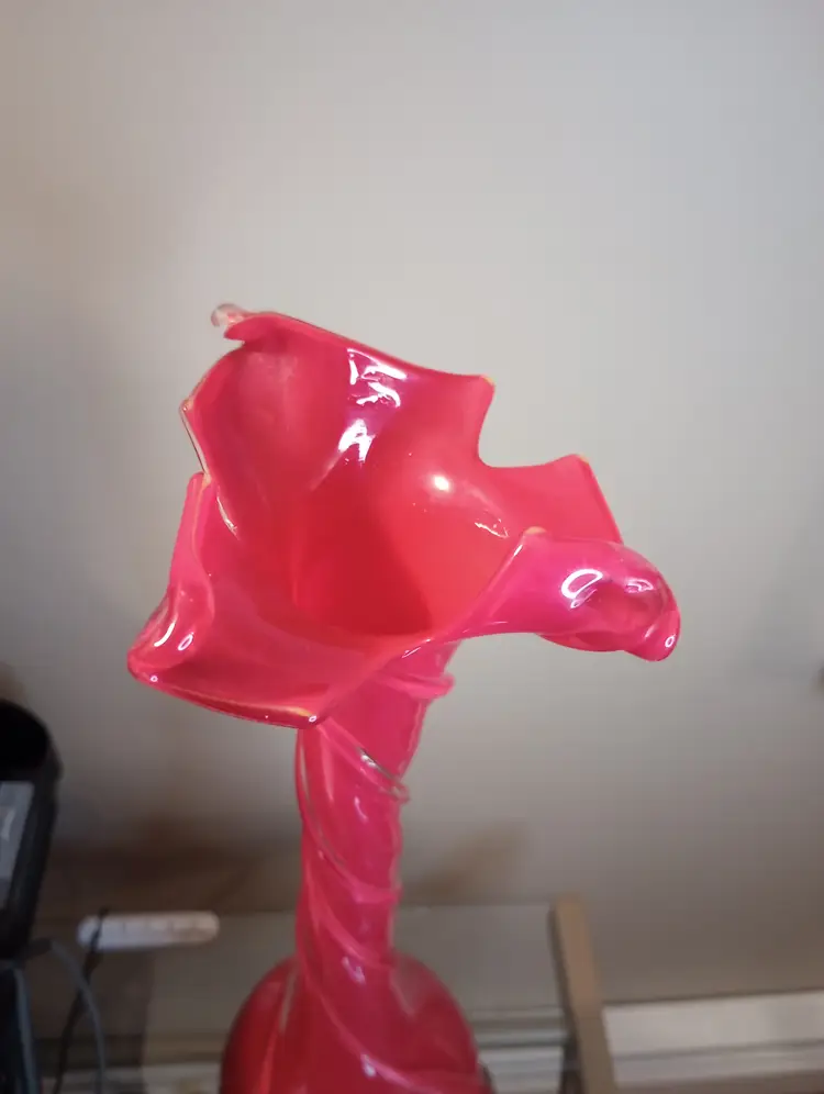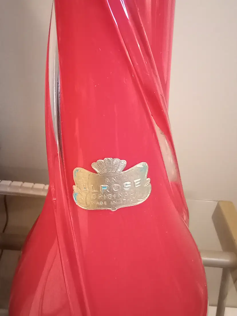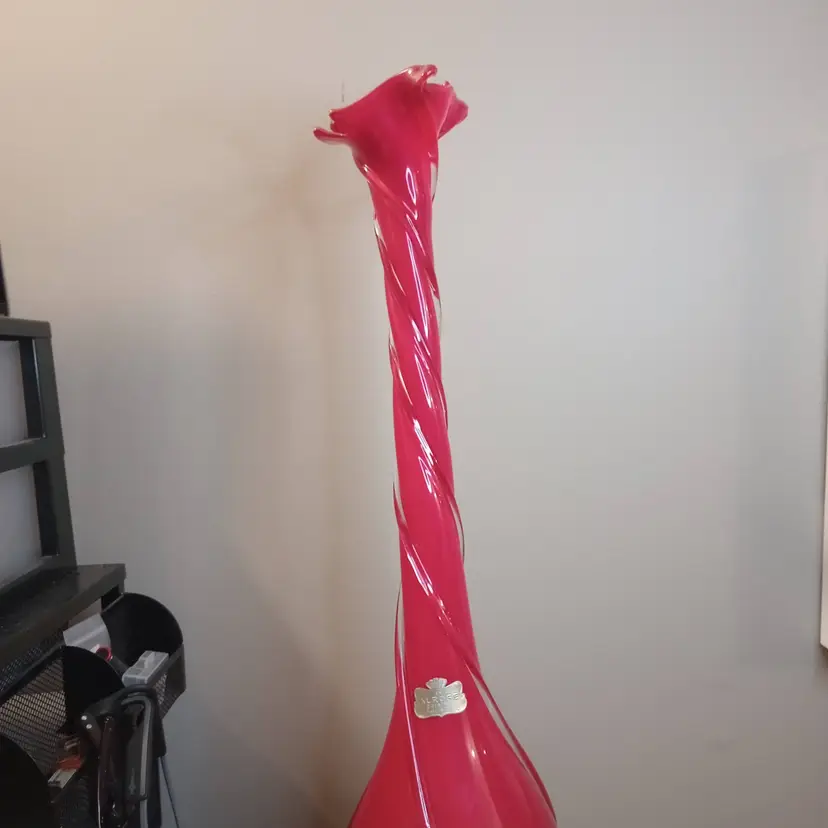This is a stunning MCM Empoli swung vase with applied trails from Cristalleria Fratelli Betti. It's a luscious red, cased in clear and has a cadmium glow on the lip. It's almost 22" tall and 6" across at the base and is in superb condition with no noted flaws. It even has it's original Alrose import label fully intact.