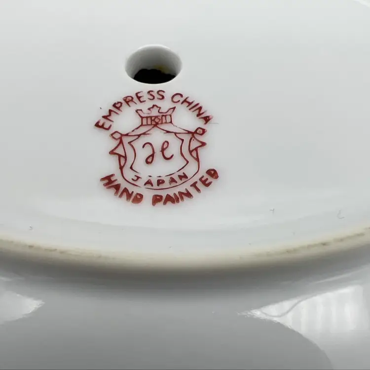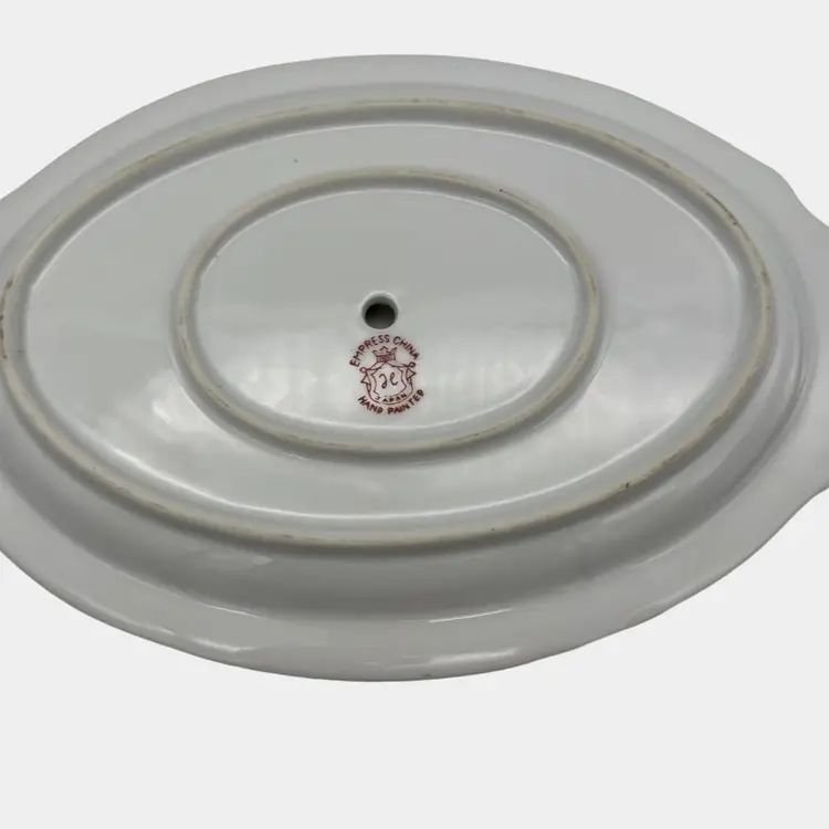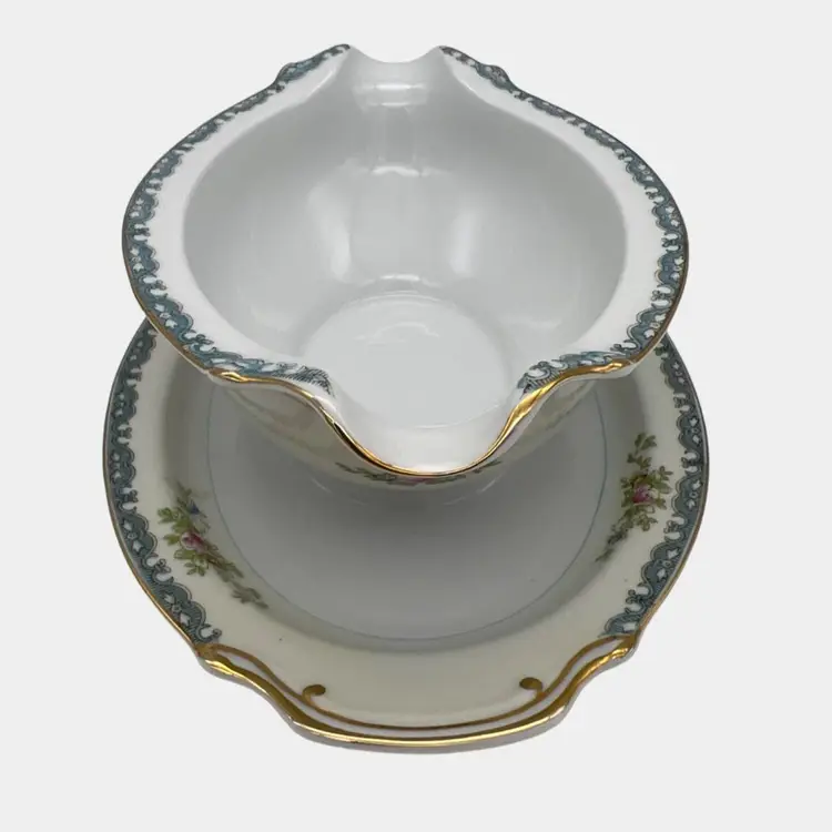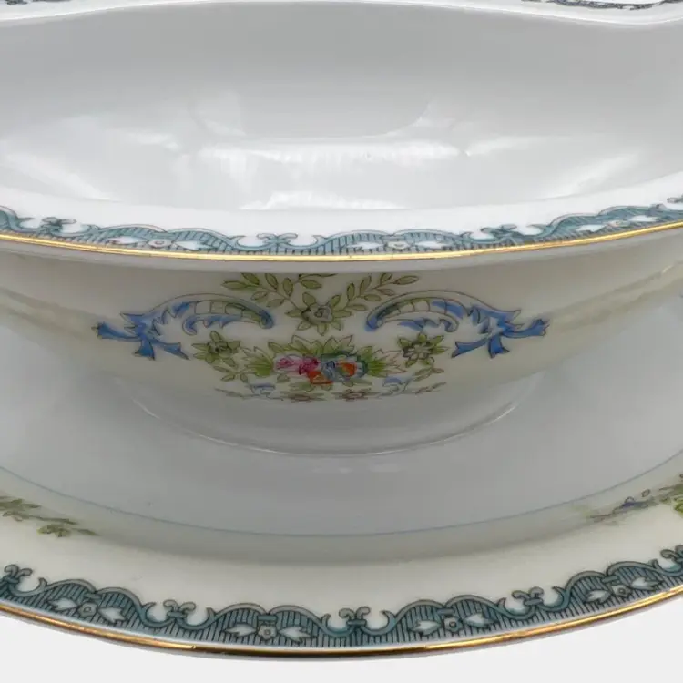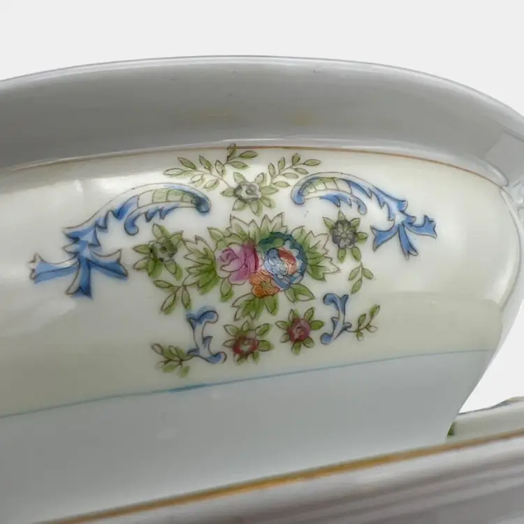 Features: • Maker: Empress China • Type: Gravy Boat with Attached Underplate • Pattern: EMP47 • Pattern Description: Blue Edge, Blue Scrolls, Multifloral Rim • Size: 9" x 6.5" • Made in Japan • Weight: 1lb 2oz • Years Made: Unknown • Current Status: Discontinued