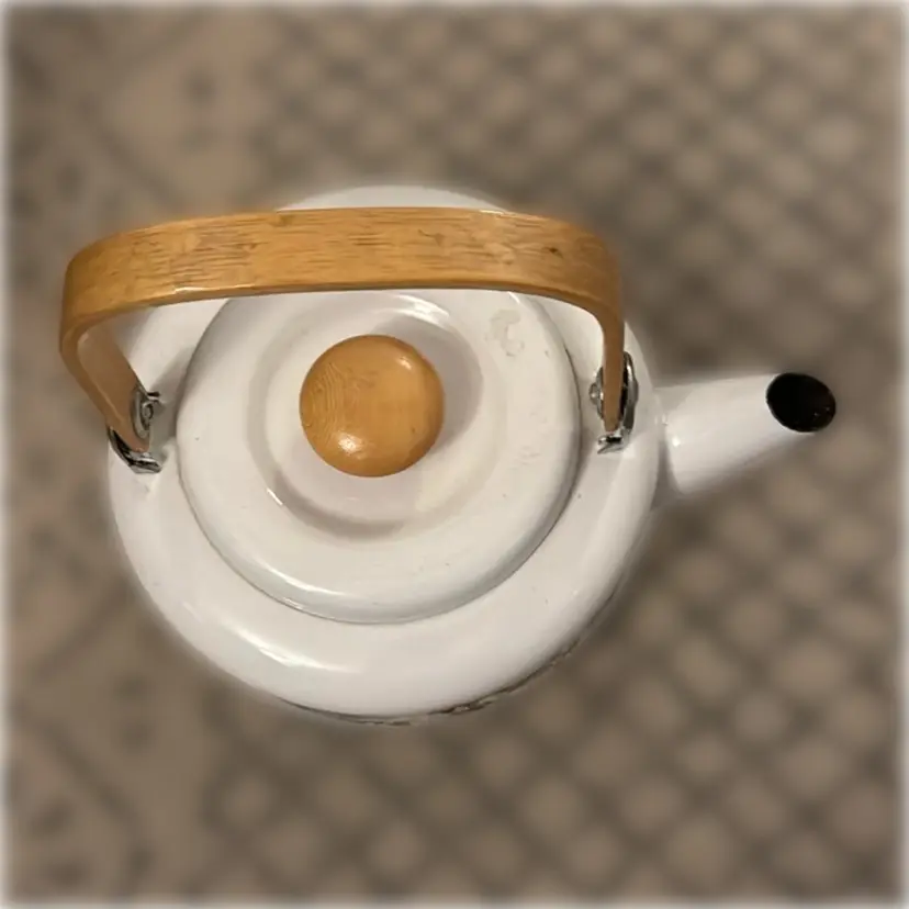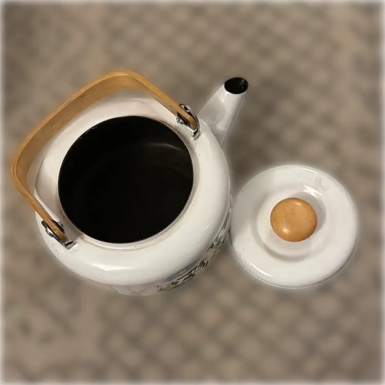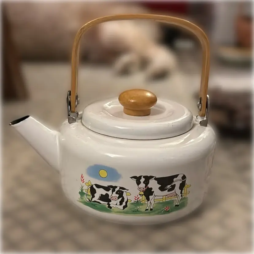 Enamel Coated Metal Cow Tea Kettle. 4.5” tall with lid and 9.75” wide.