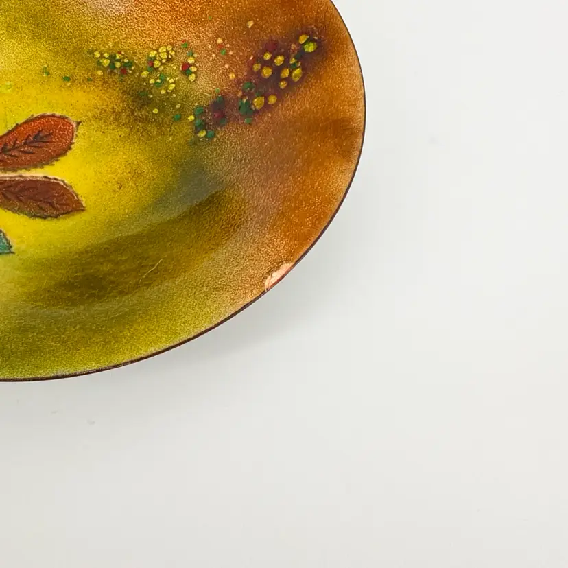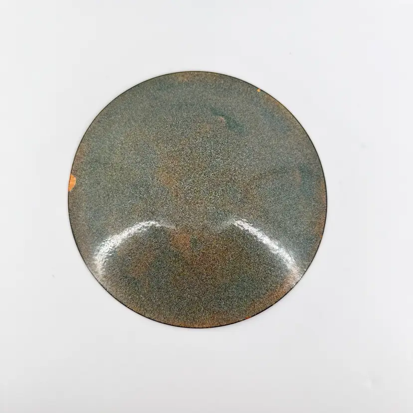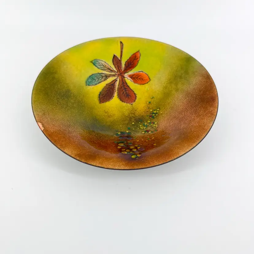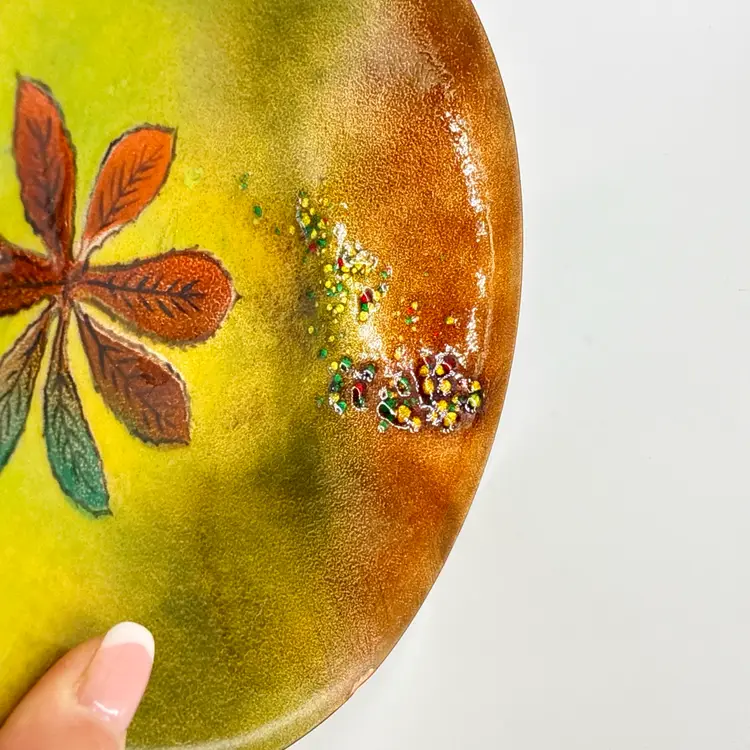It measures 7.5" in diameter and is in good condition. There are no cracks, breaks or repairs. There is a small enamel chip on one edge. (See photos).