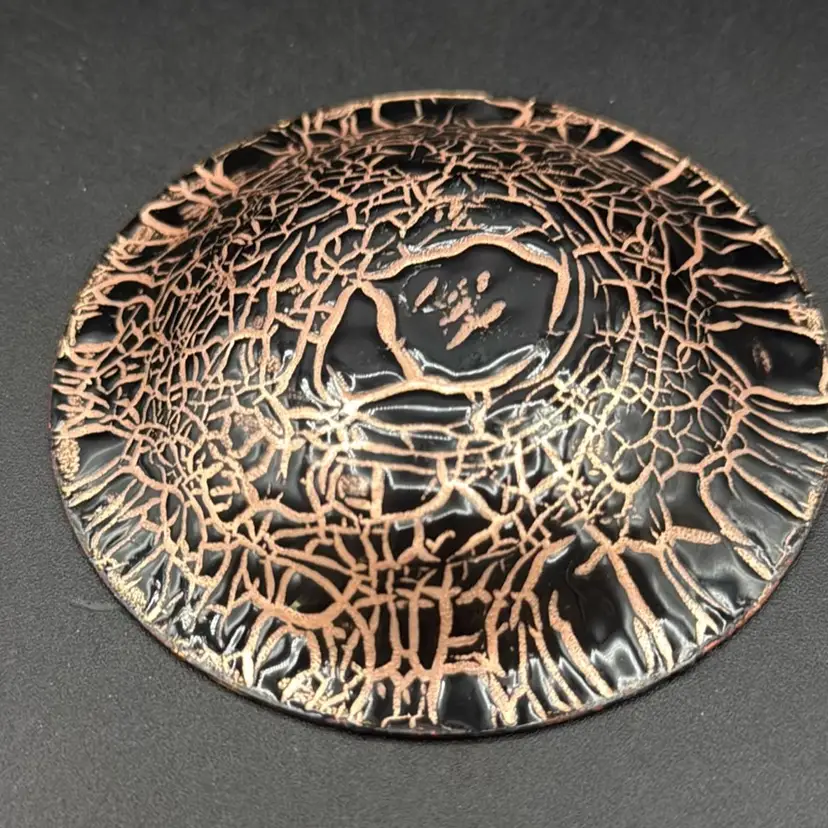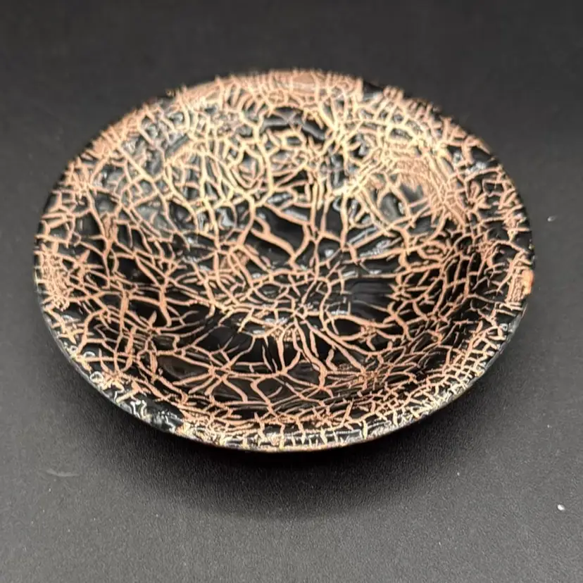 Enamel on copper trinket dish. No damage Beautiful black and copper enamel detailing. Measures 4.25”