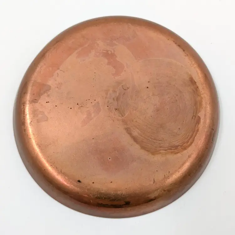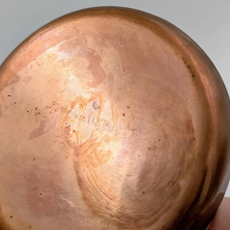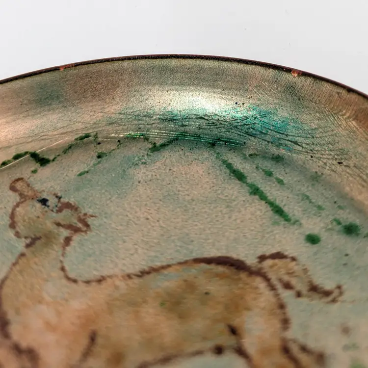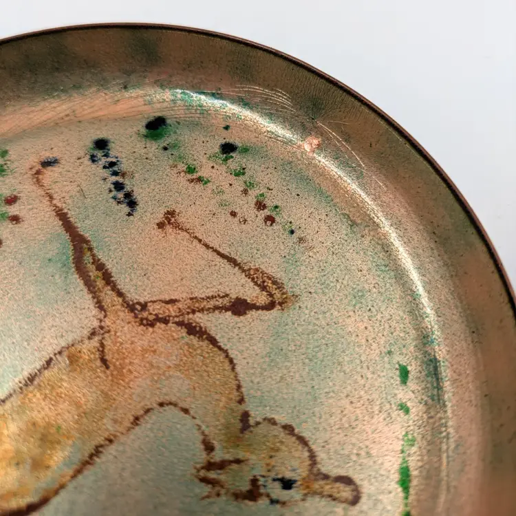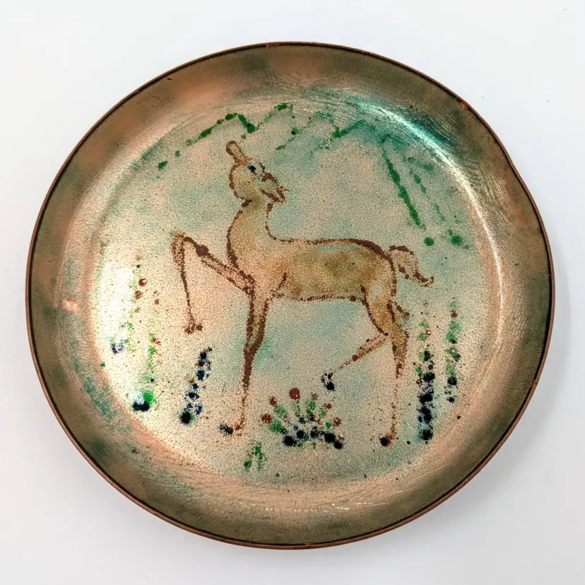 Enamel on copper trinket dish with a deer frolicking amongst some flowers. This cute piece does have some condition issues, one edge is a bit bent in and it has 3 chips with some crazing along the edges. Signed on the bottom Florence Whitehead.