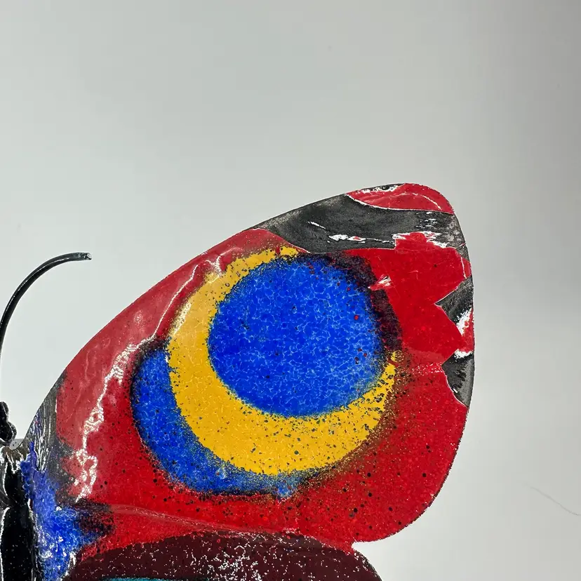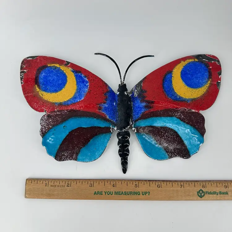 Metal butterfly wall hanging with Enamel front and back. No signings or markings. Measures approximately 9.4” long. Enamel is cracked in some spots, as shown in pictures.
