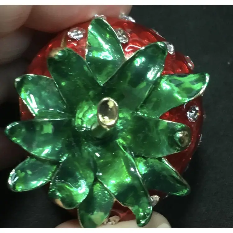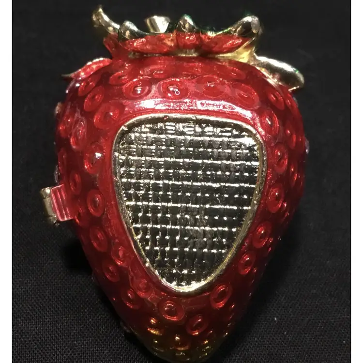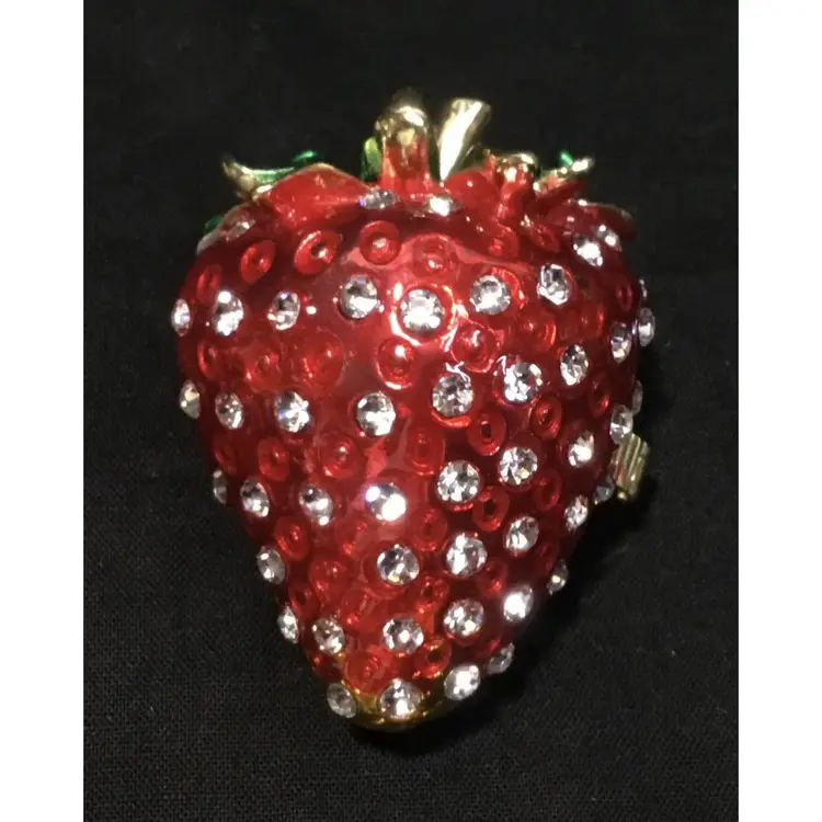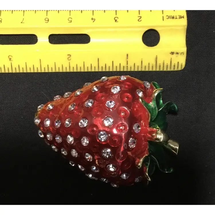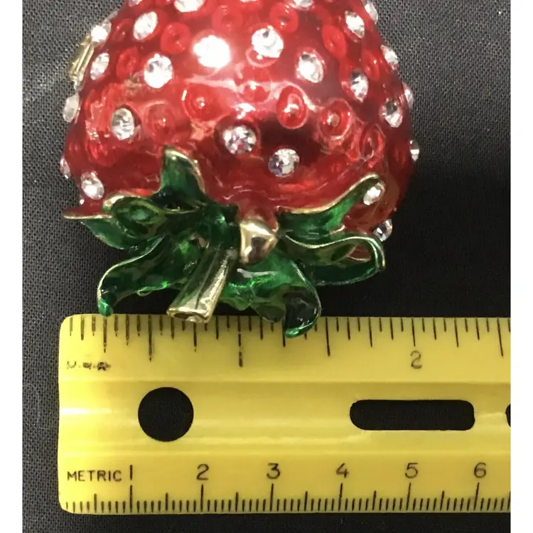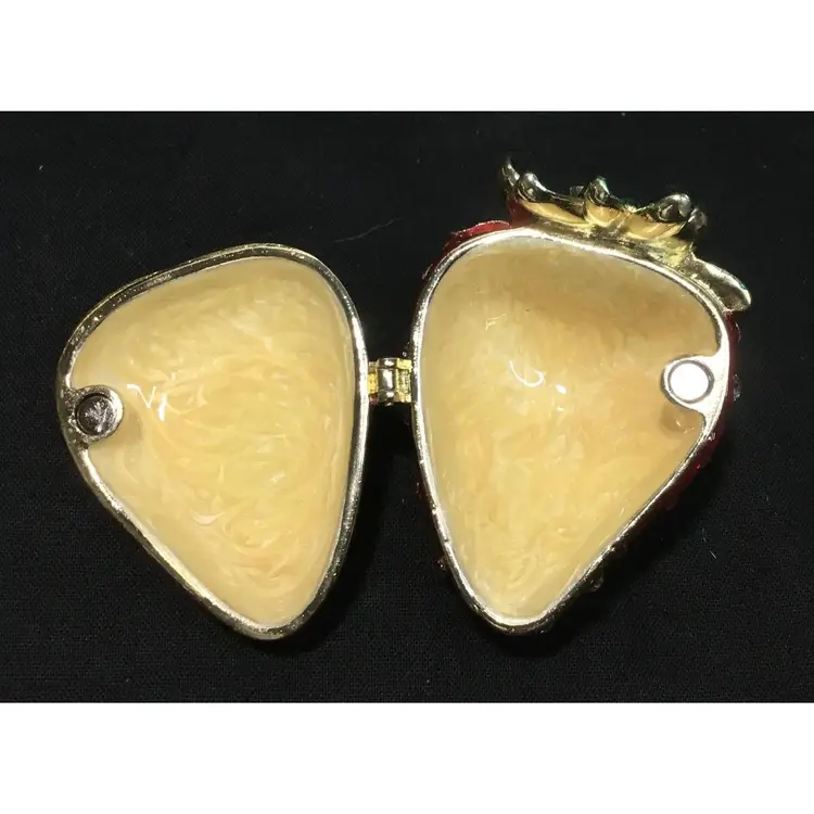 2.5 inches long by 2 inches wide, strawberry with clear rhinestones on the top, red enameling, green enamel on leaves, yellow on the tip. Inside is smooth cream-colored enamel. Magnetic closure.