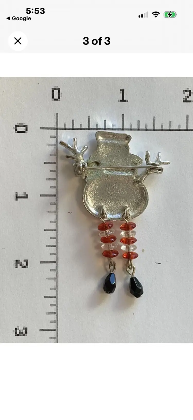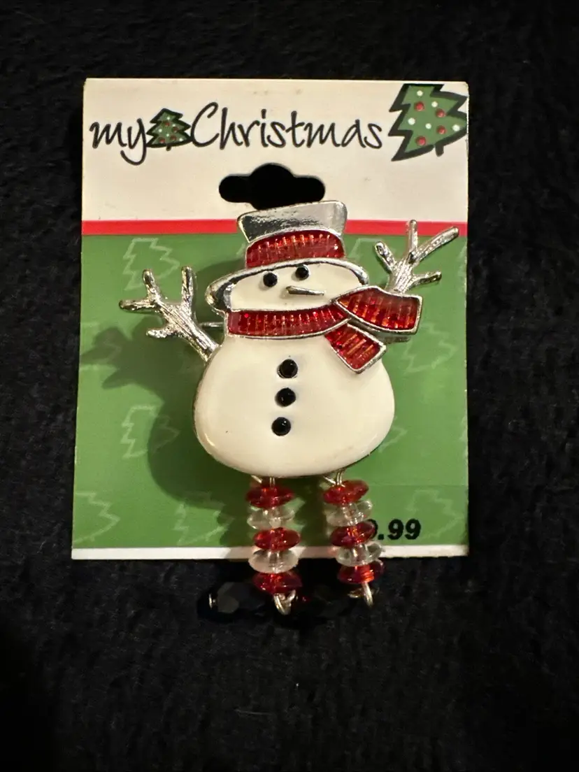 This Enamel Snowman Christmas Holiday Pin/Brooch is a vintage-inspired accessory perfect for the holiday season. The multicolor design features a snowman shape with articulated dangling beads as legs and feet, adding a playful touch to any outfit. Measuring 2.5 inches in length, this fashion jewelry piece is a fun and festive addition to your collection.