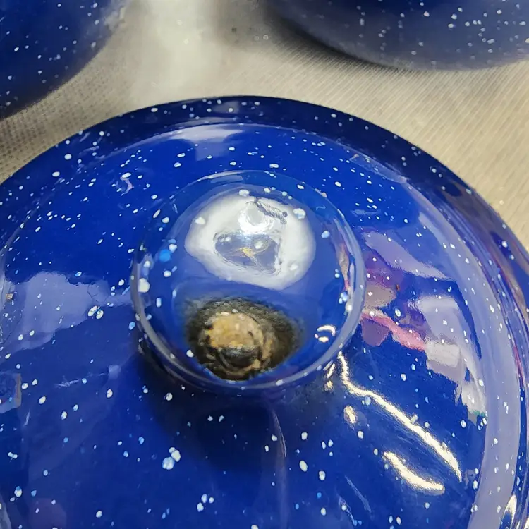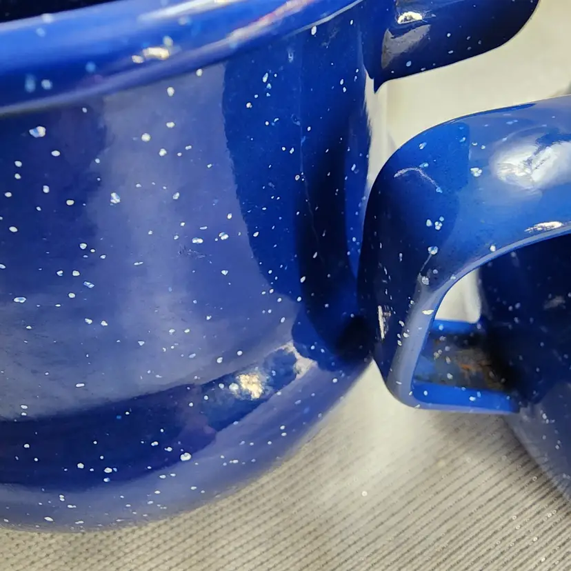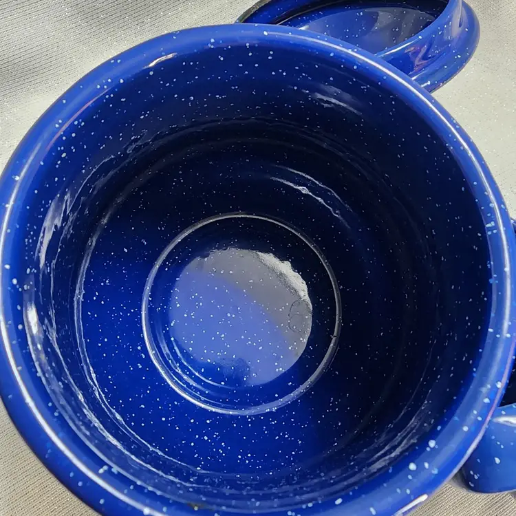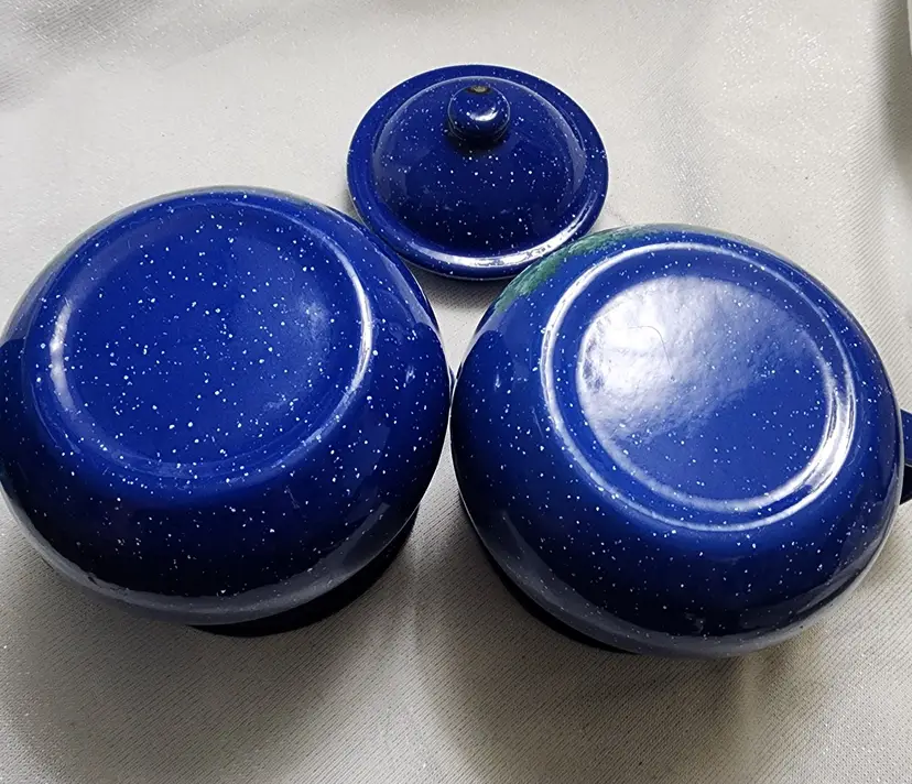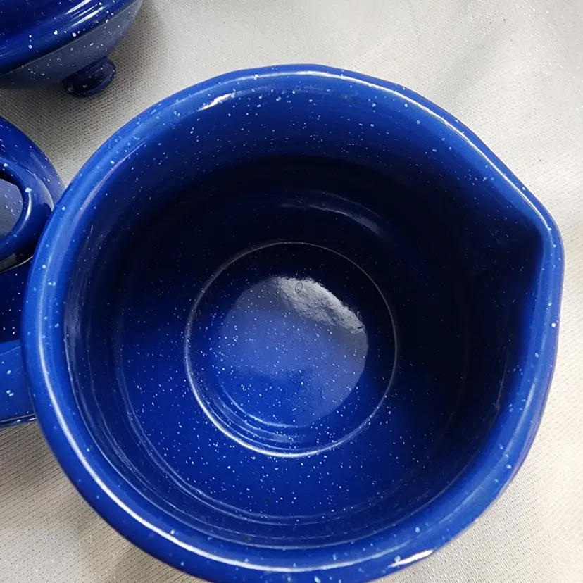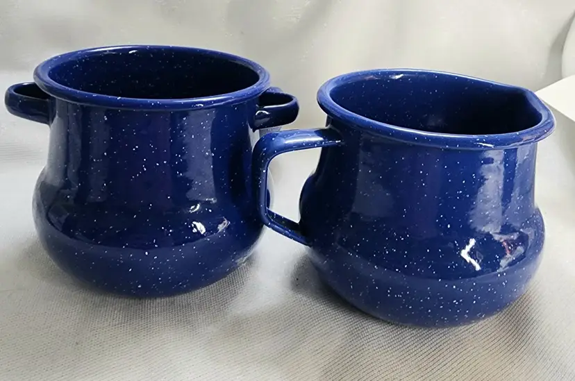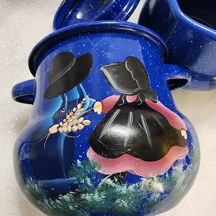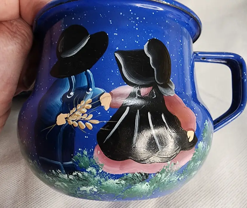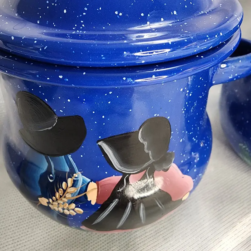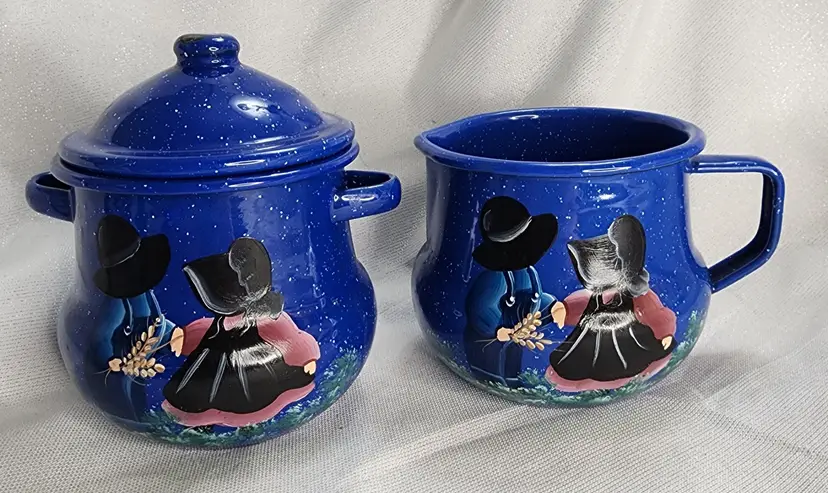 Rustic Farmhouse Décor, blue speckled enamelware squat creamer & sugar bowl with lid. Hand painted design that reminds me of sunbonnet Sue, girl in black & grey bonnet & apron over shades of pink dress, boy in black & grey hat in blue overalls holding pink flowers, standing in shades of green grass. Lid was intentionally distressed.