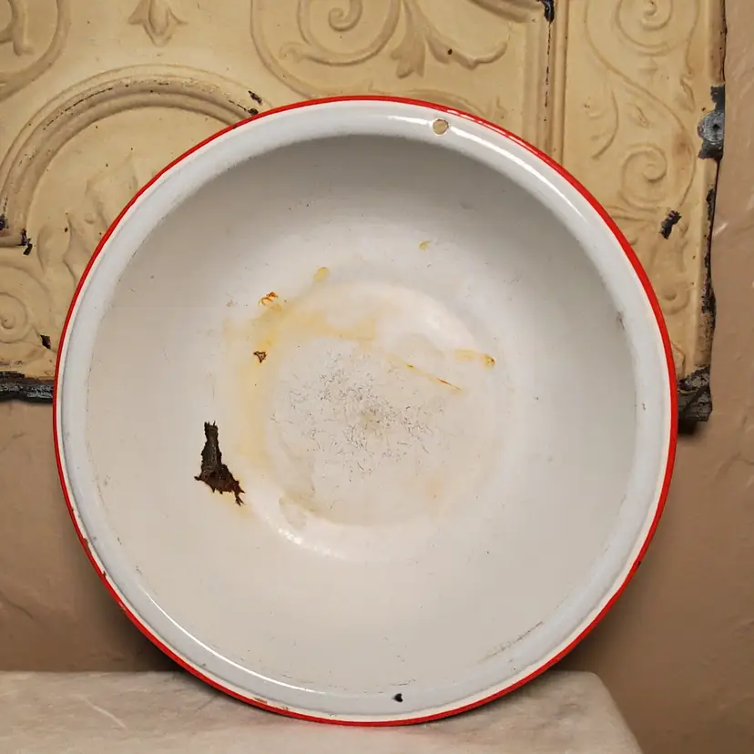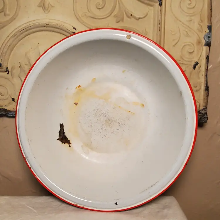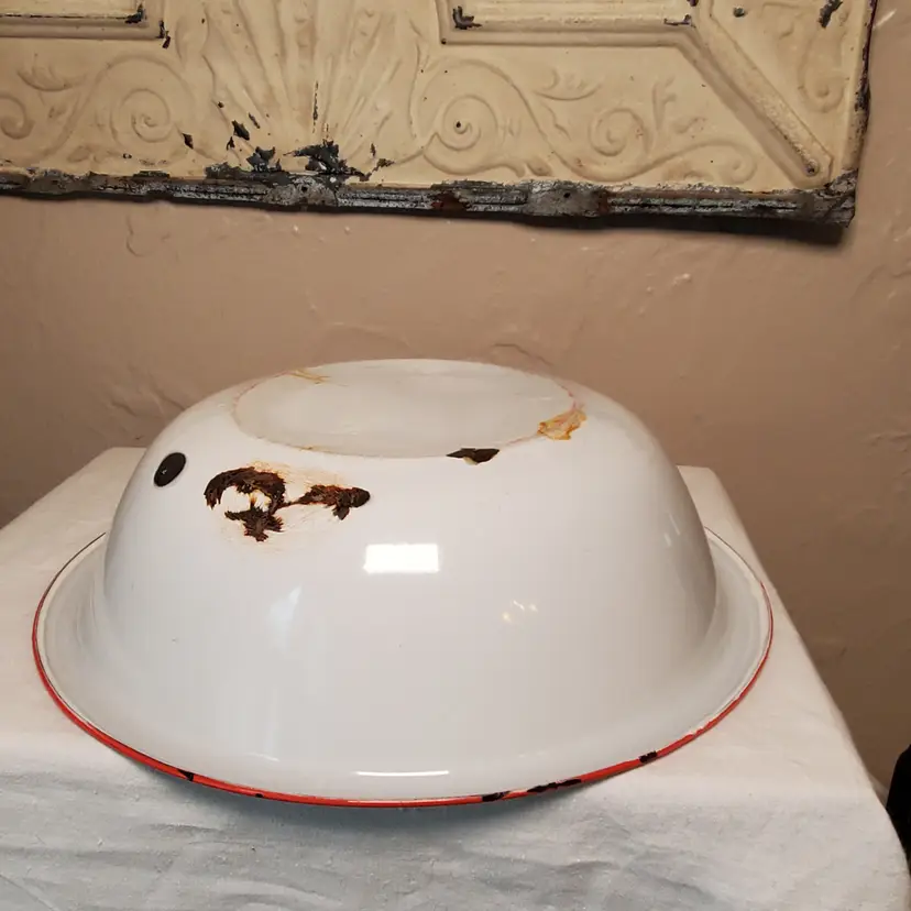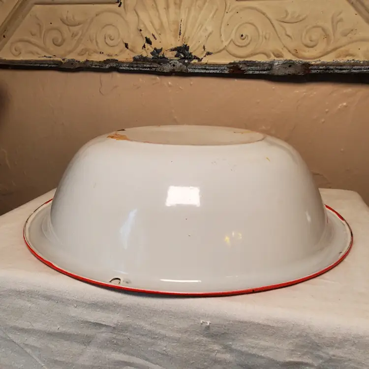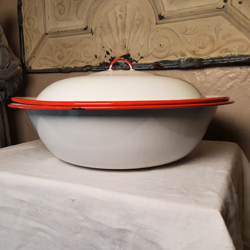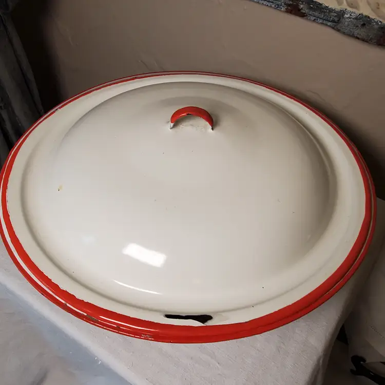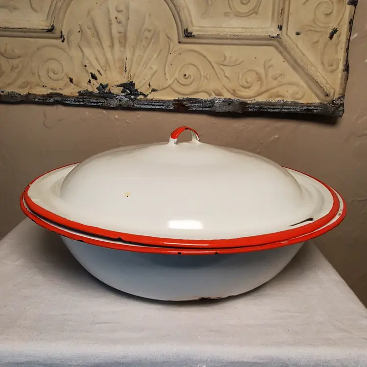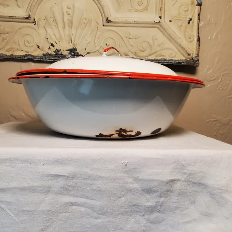 This is a vintage enamelware pot with lid. Perfect for styling with greenery for the holidays or year-round. 3" tall. 11 3/4" diameter at top. Based on age and wear, this is for decorative purposes only.
