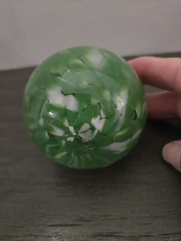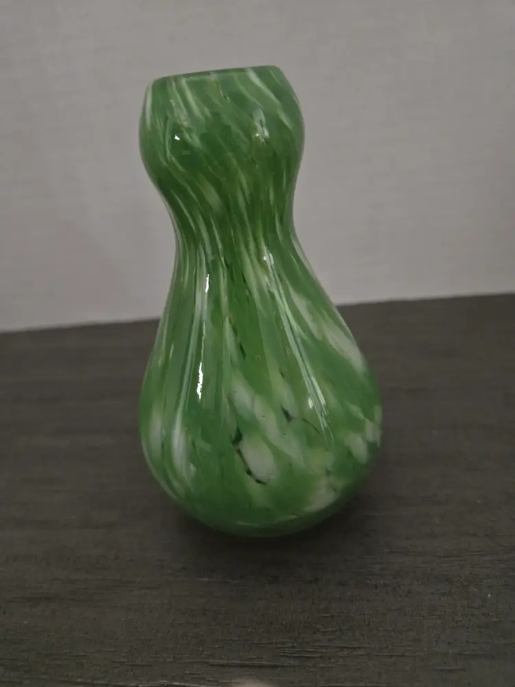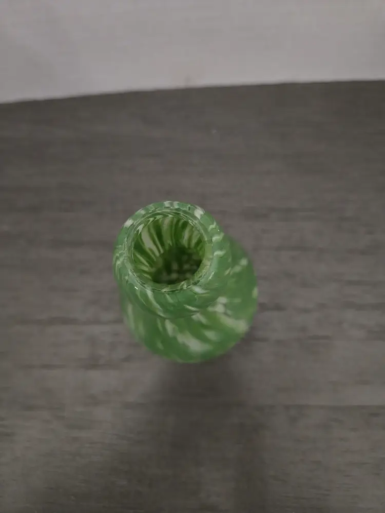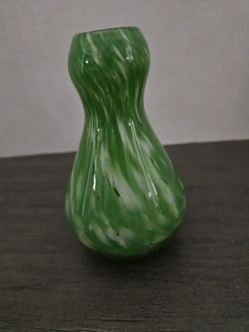 4" tall green, white, clear bud vase, no signature, green and white are encased in clear, thick and heavy for its size, no chips or cracks