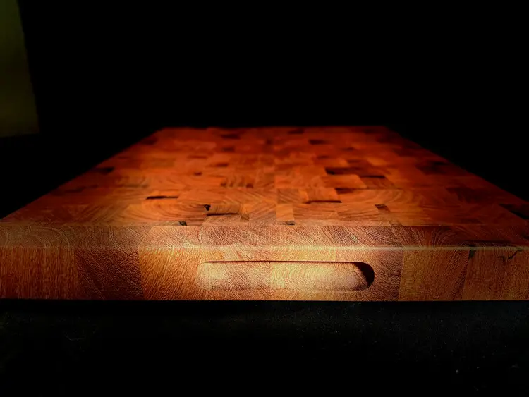 Every board is carefully conditioned through a multi-step finishing process. The wood is thoroughly saturated with food-safe mineral oil and allowed to cure for several days, providing deep protection from the inside out. It is then finished with a beeswax blend, providing a smooth, durable surface that enhances the wood's natural beauty while remaining completely food-safe.