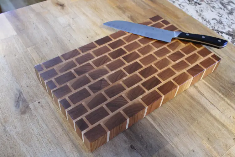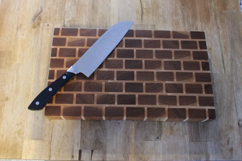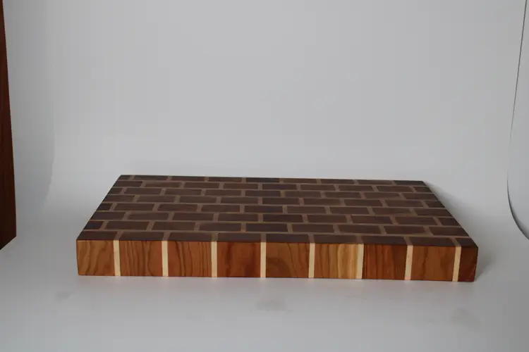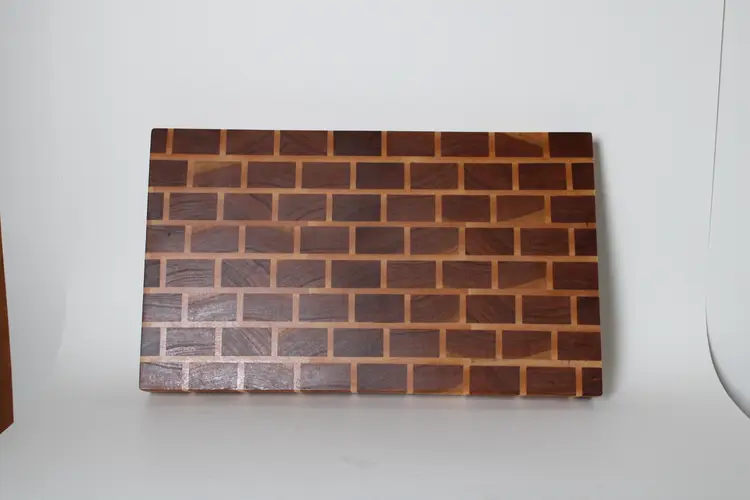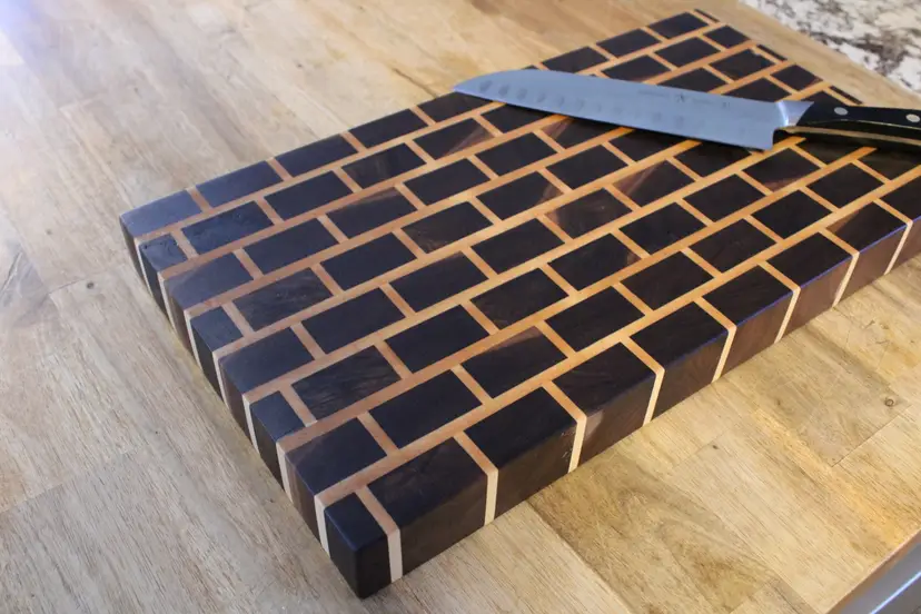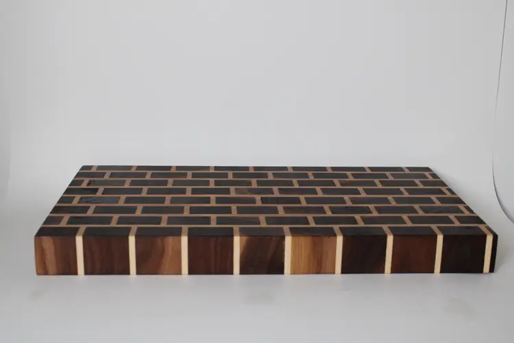 End grain Walnut and Maple cutting board sanded to 220 grit, soaked in mineral oil to protect the board from moisture, and sealed with home-made beeswax board butter to protect the wood and provide a silky smooth finish.