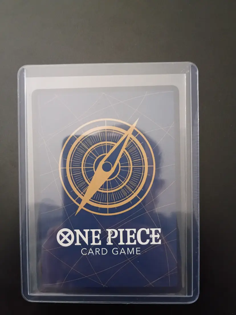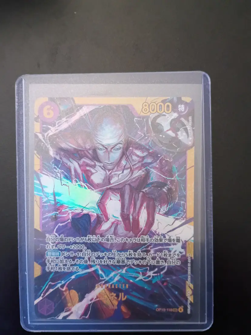Vibrant Enel holographic trading card in protective sleeve. A stunning addition for any anime card collector!