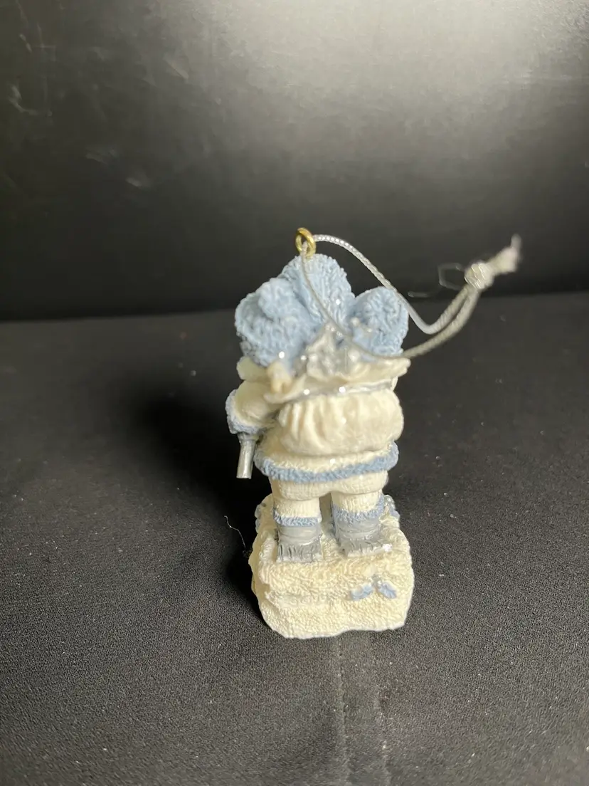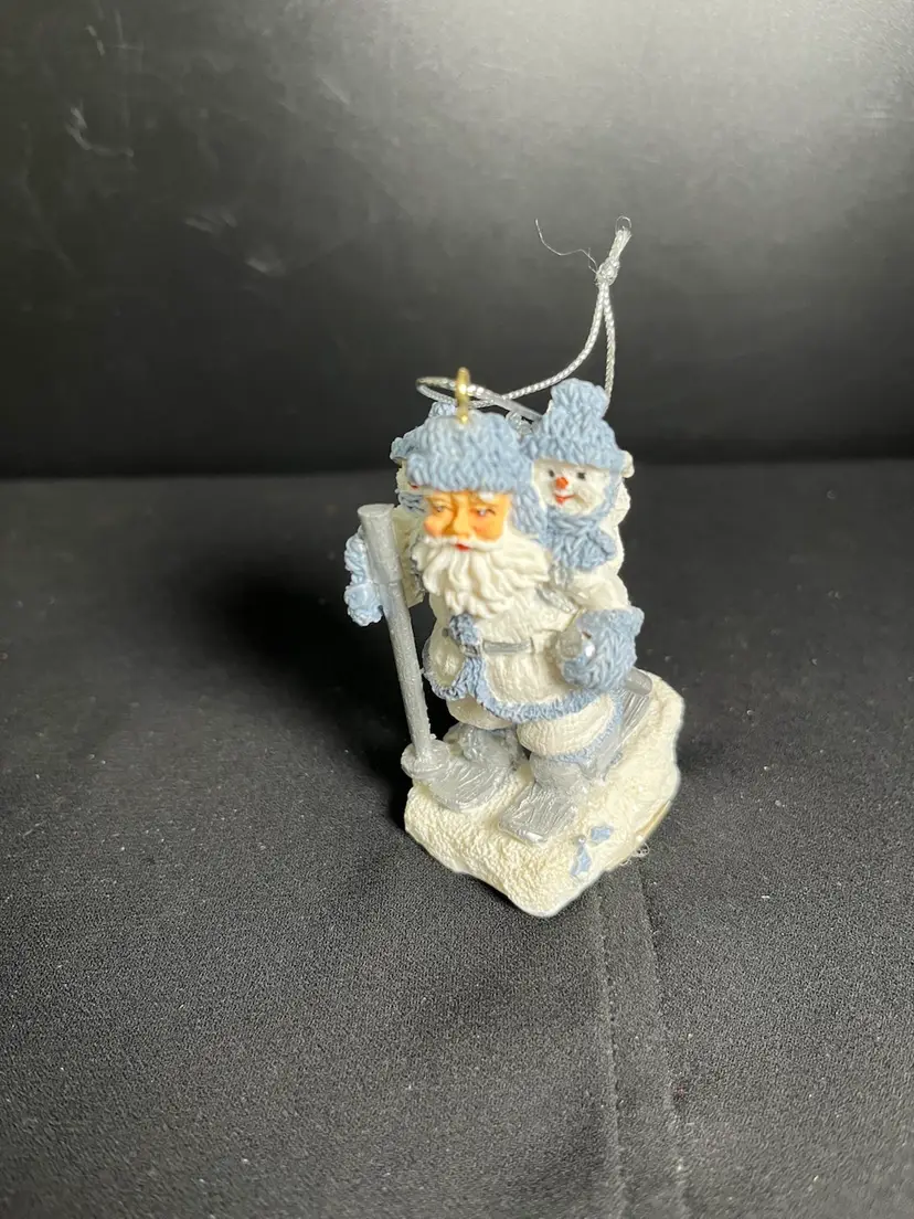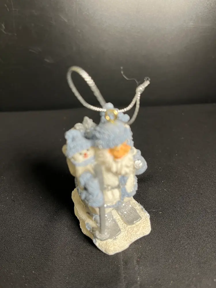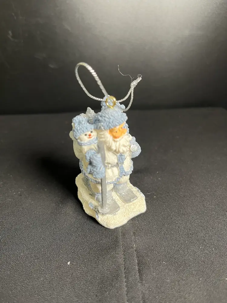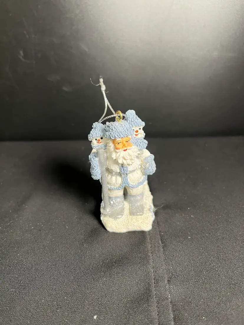Cute as can be. Cool as can be, too! Blue & White Santa and Snow Buddy Snowmen!. Has a hanger. No call outs and is in good condition. Use as an ornament or in a vignette. It measures approx 3"H, 1.5"W, 1"Deep, 2.2 Oz