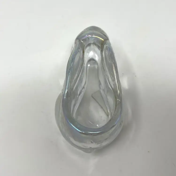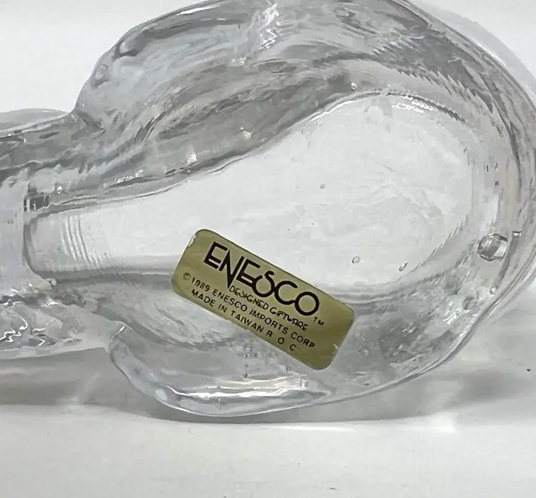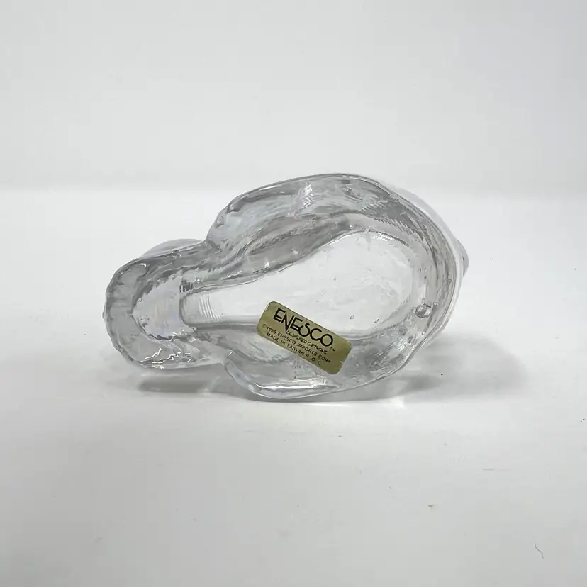 Molded clear glass bunny candle holder by Enesco, circa 1989 — clear body with a shifting iridescent luster that catches blue, green, and purple depending on the light. Original gold foil sticker intact on the base.
