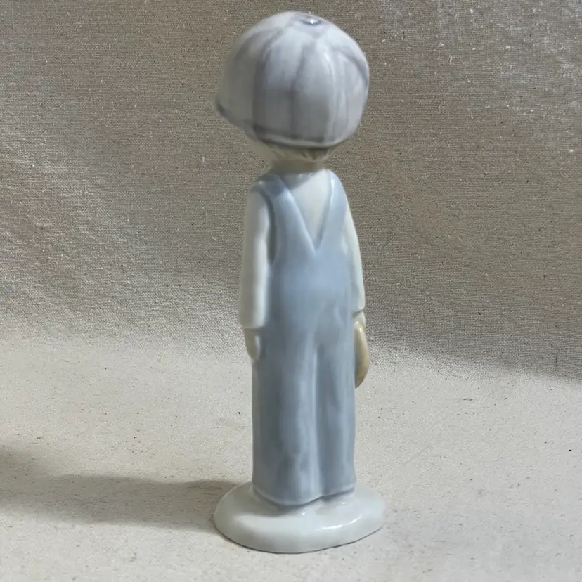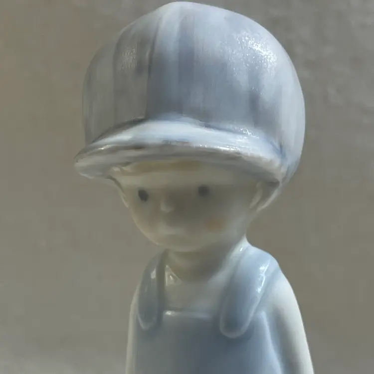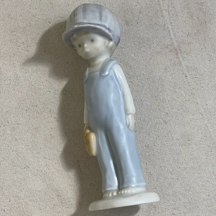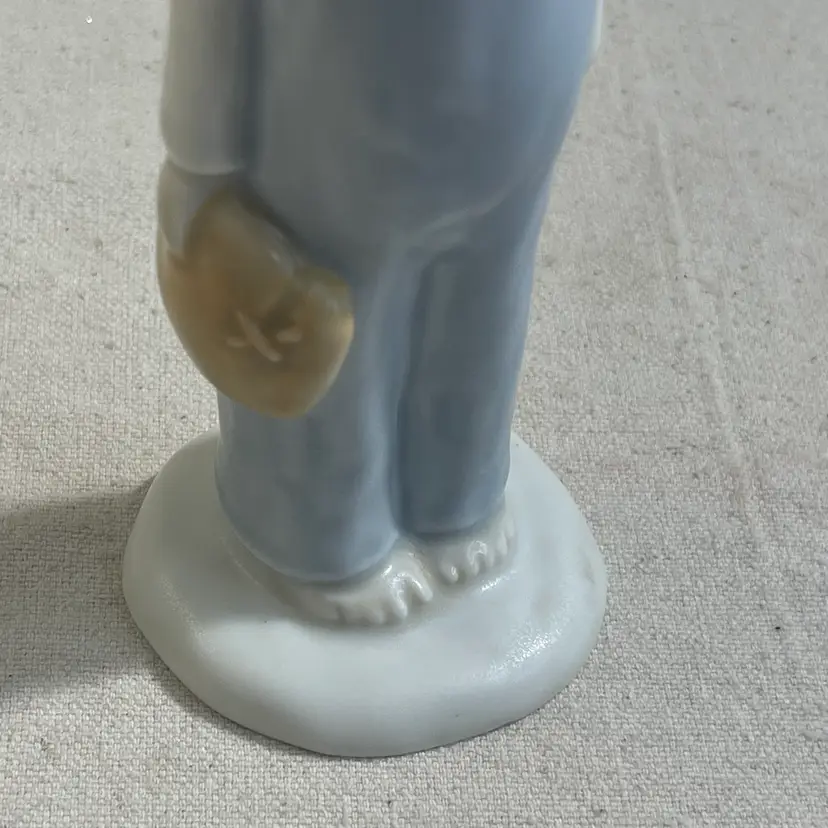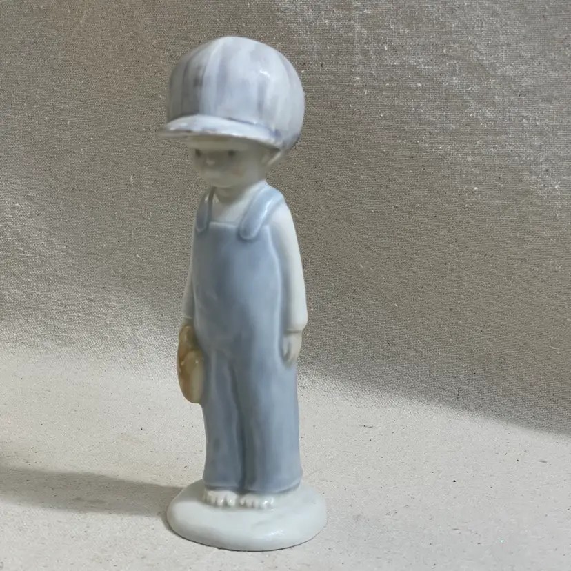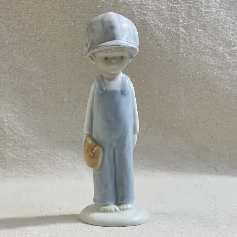This Enesco Kinka figurine is a unique addition to any room. The boy is depicted with a baseball cap, glove, and bare feet, making it a great piece for teens or adults who love baseball. The figurine is made of porcelain and has a matte finish, with an all-over multicolor pastel pattern.
