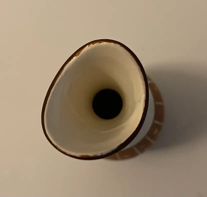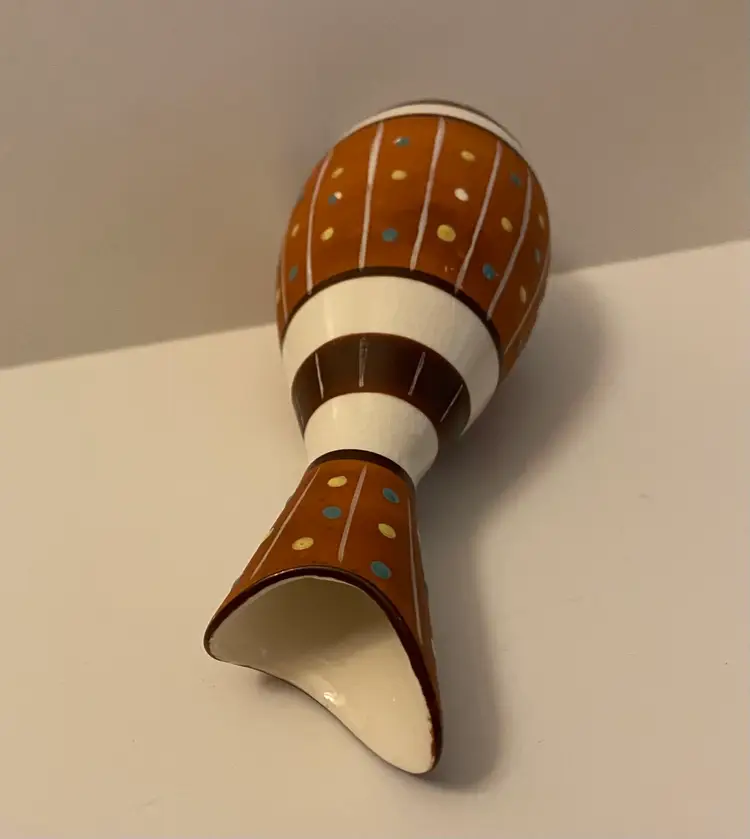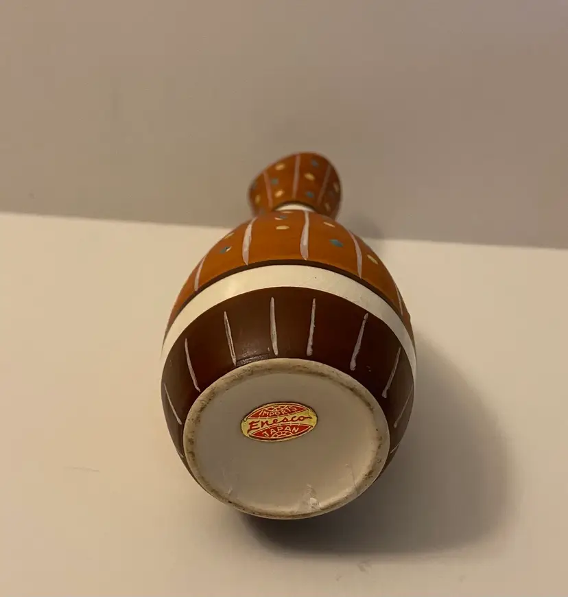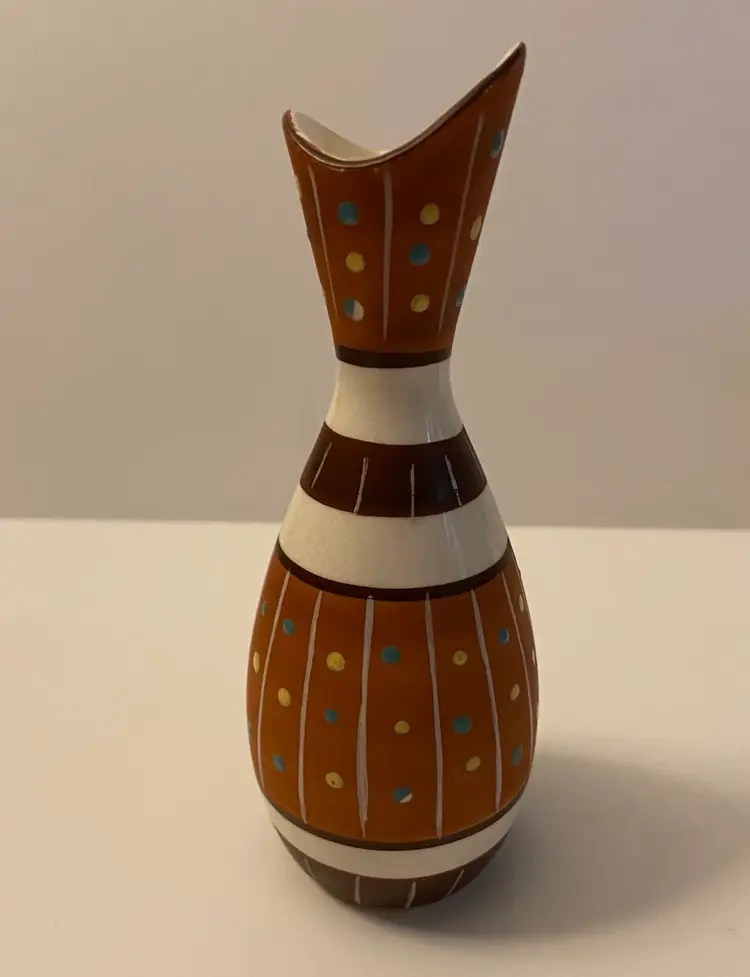 Vintage Enesco mid-century, modern striped ceramic vase with raised dots. This vase has a funky design and is visually pleasing. There are a few blue paint spots that are chipped, but overall this vase is in great condition.