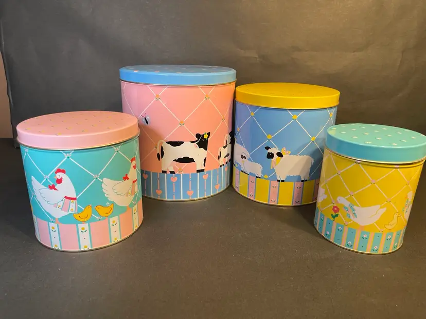 These Enesco Nesting Tins feature Farm Animals in a pastel color way set is a must-have for any collector of kitschy retro 80s decor. The set includes four nesting tins featuring cows, sheep, chickens, and ducks.