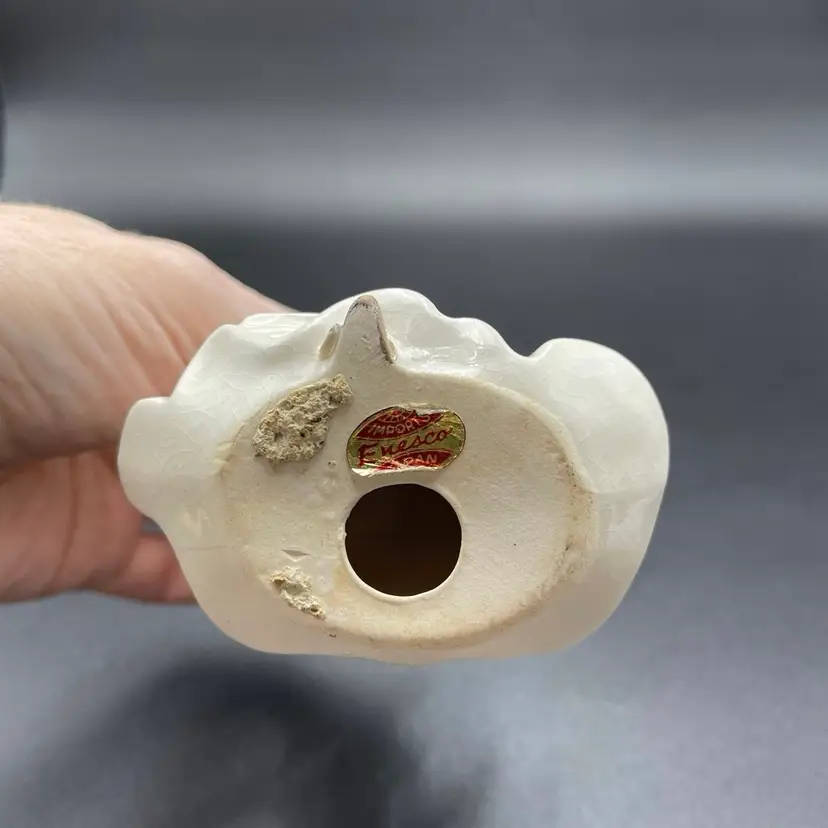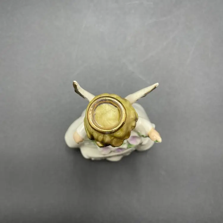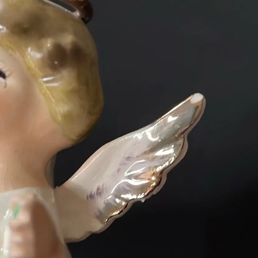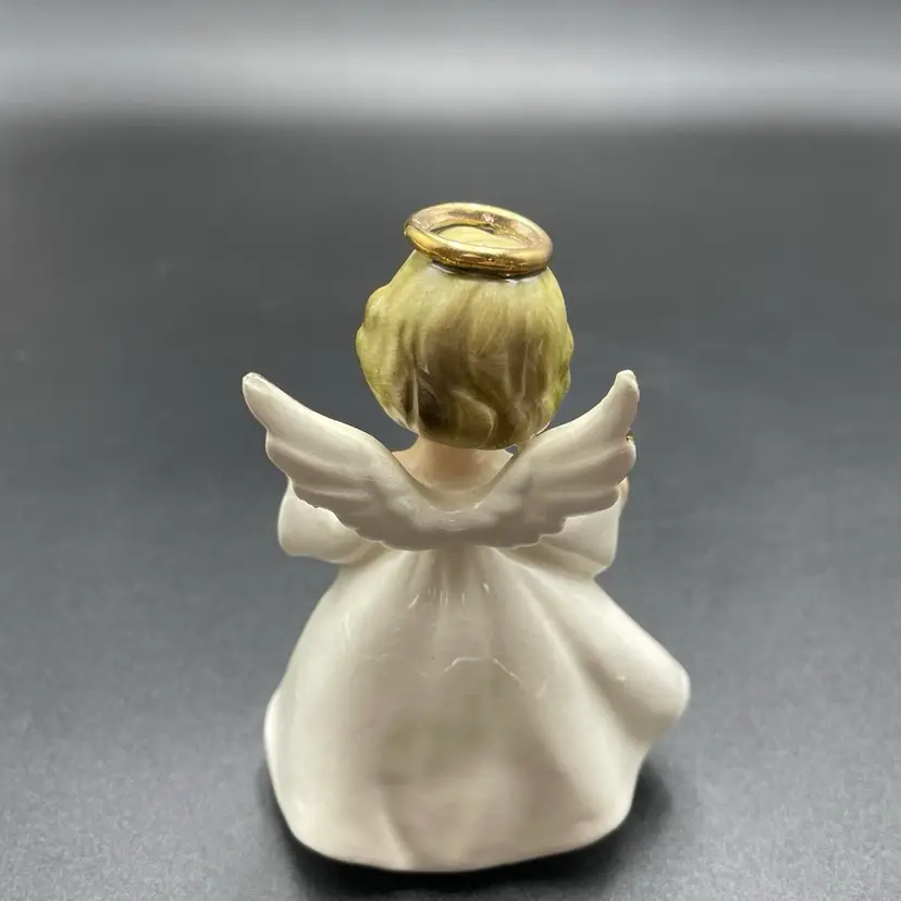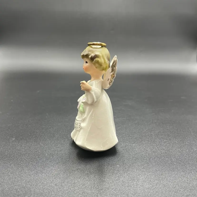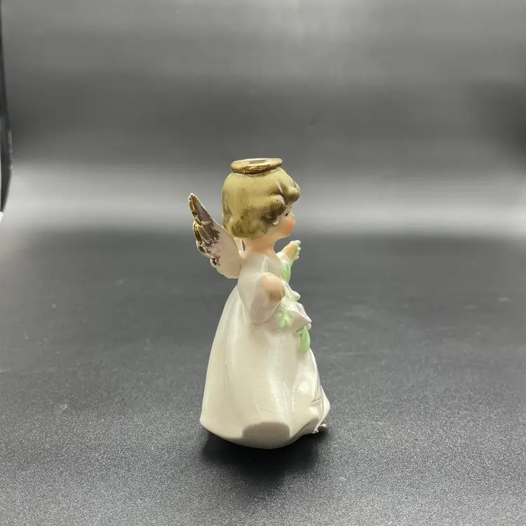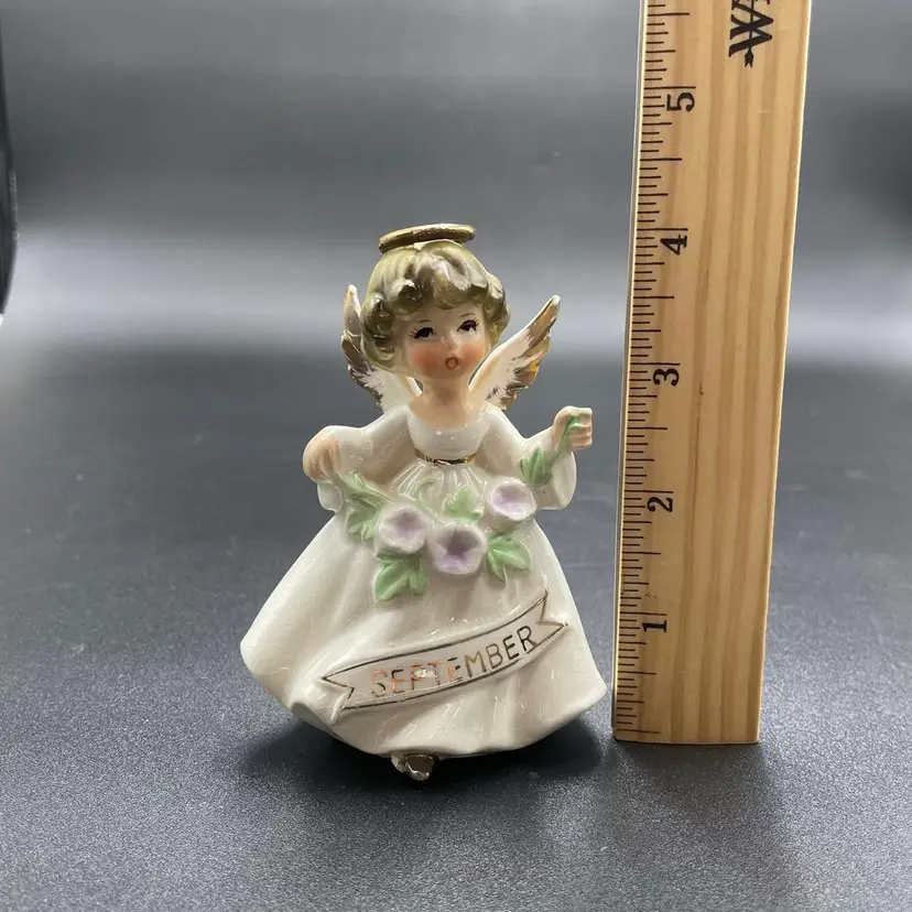 This is a vintage Enesco porcelain September angel figurine. She measures approximately 4" tall. Still has original label attached. The tip of her left wing has a paint chip, as shown in pictures. No other major flaws.