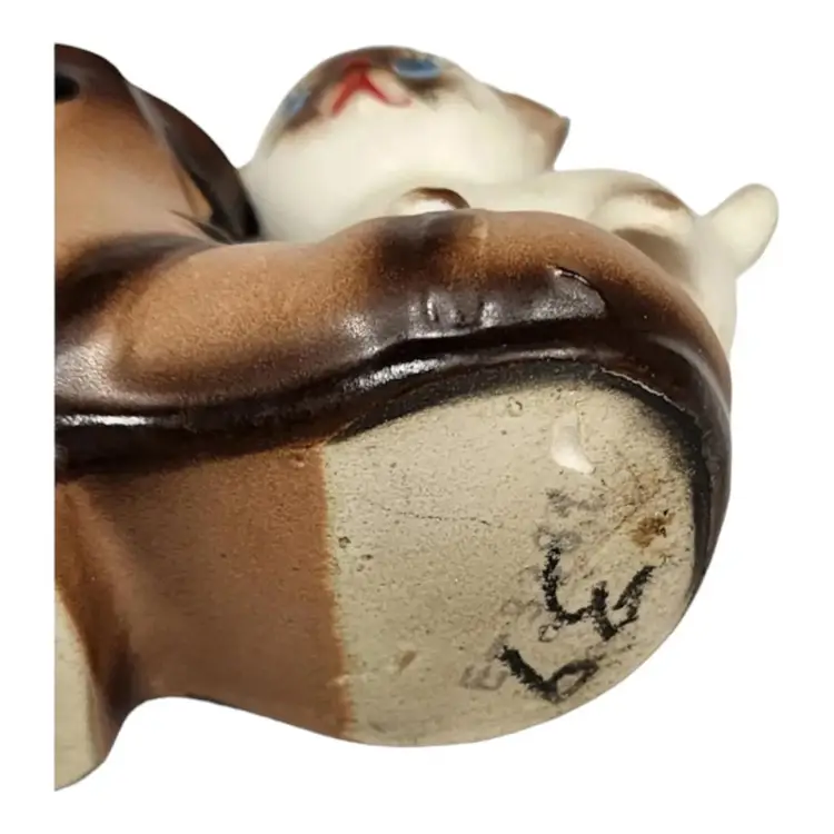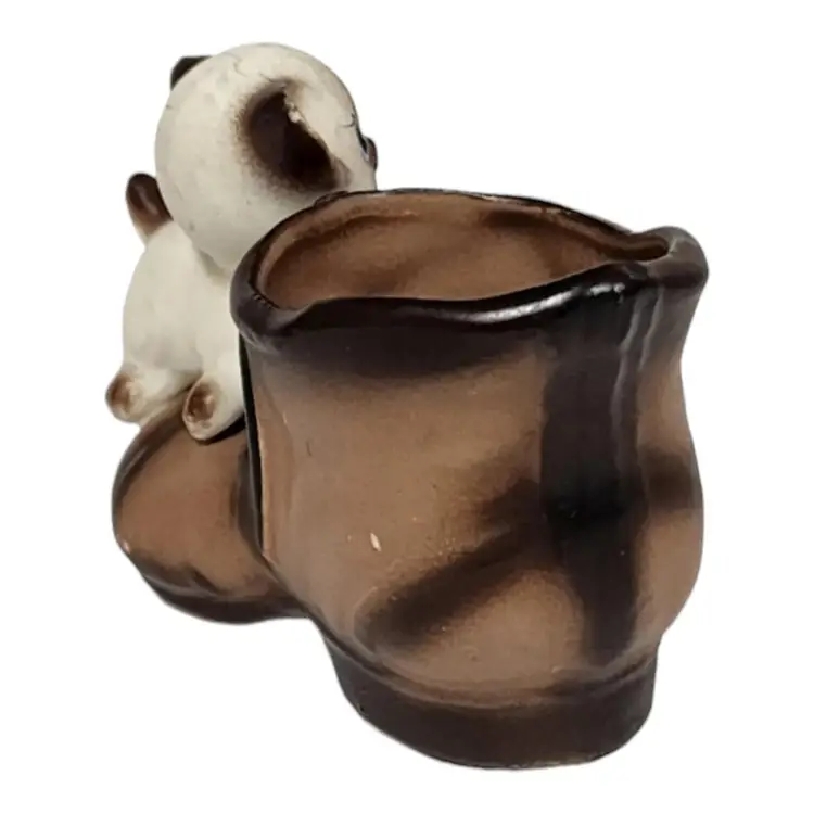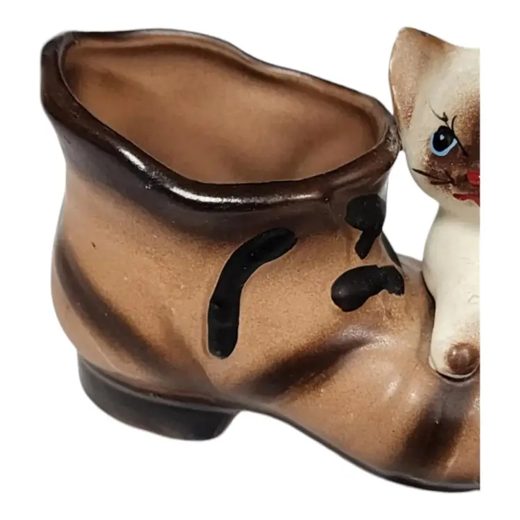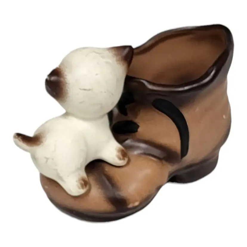 Add a touch of kitschy charm to your kitchen decor with this Vintage 1950s Enesco Siamese Kitten Cat on Boot Toothpick Holder. Crafted with attention to detail, this delightful piece embodies the whimsy of the '50s. Whether used as a functional toothpick holder or displayed as a collectible, it's a must-have for lovers of vintage kitchen decor. The Siamese kitten cat perched on the boot adds a playful and nostalgic touch to your space.