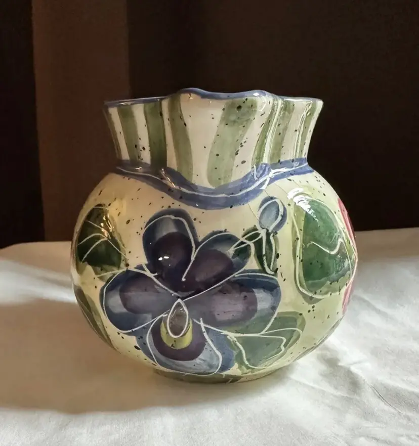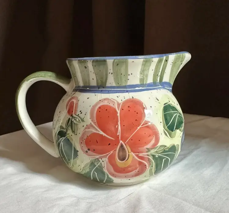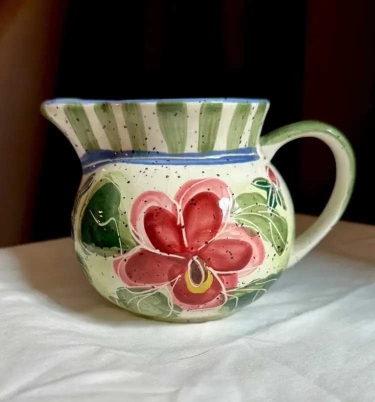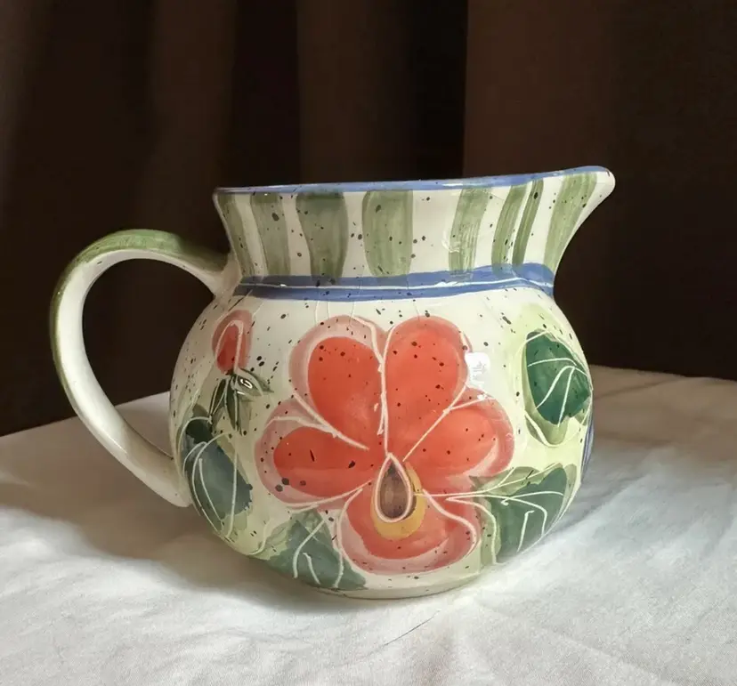 Adorable Enesco Julie Ueland pitcher/creamer. Different color flowers in each side. 4” tall x 6” with handle. No chips or cracks.
