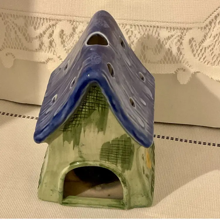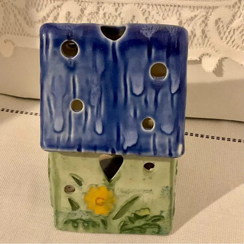 Vintage 2000 Enesco birdhouse votive candle holder Garden design with dragonfly, ladybug and floral motifs Ceramic/Stoneware Holds a standard votive or tealight candle