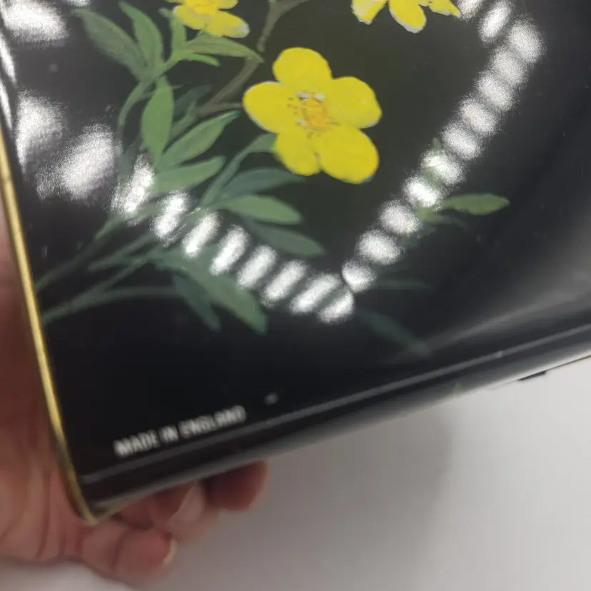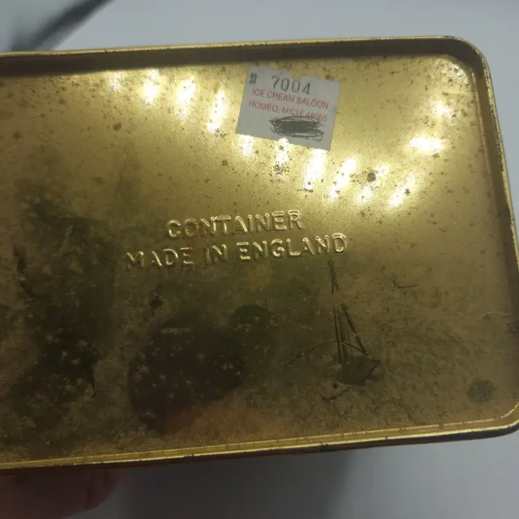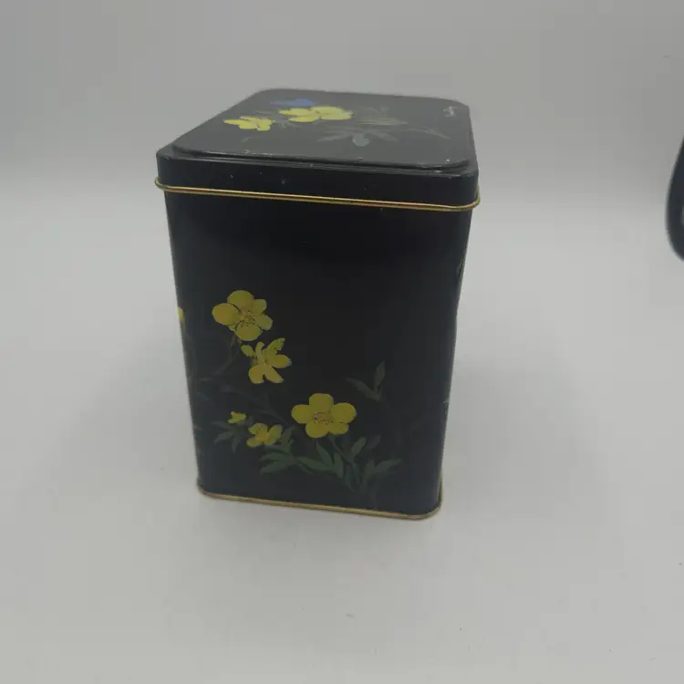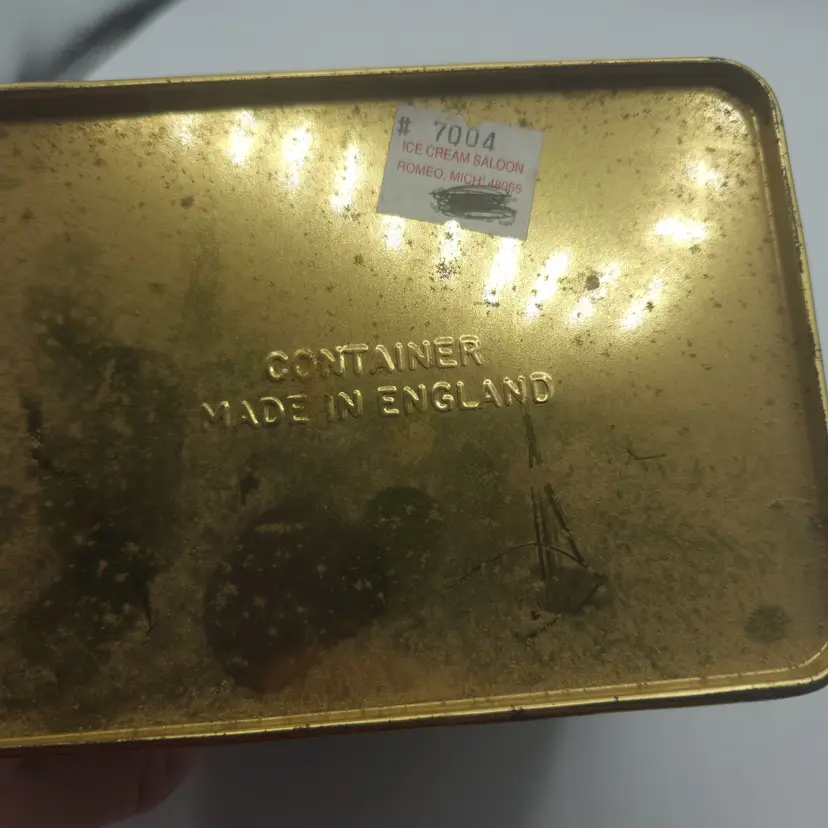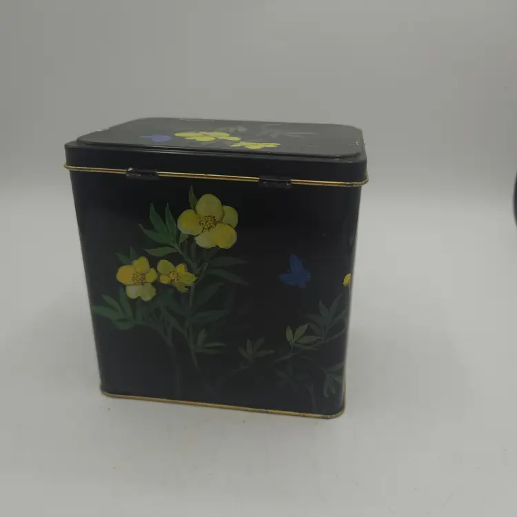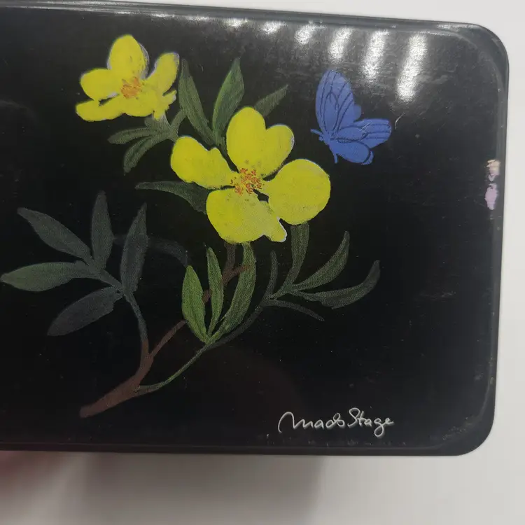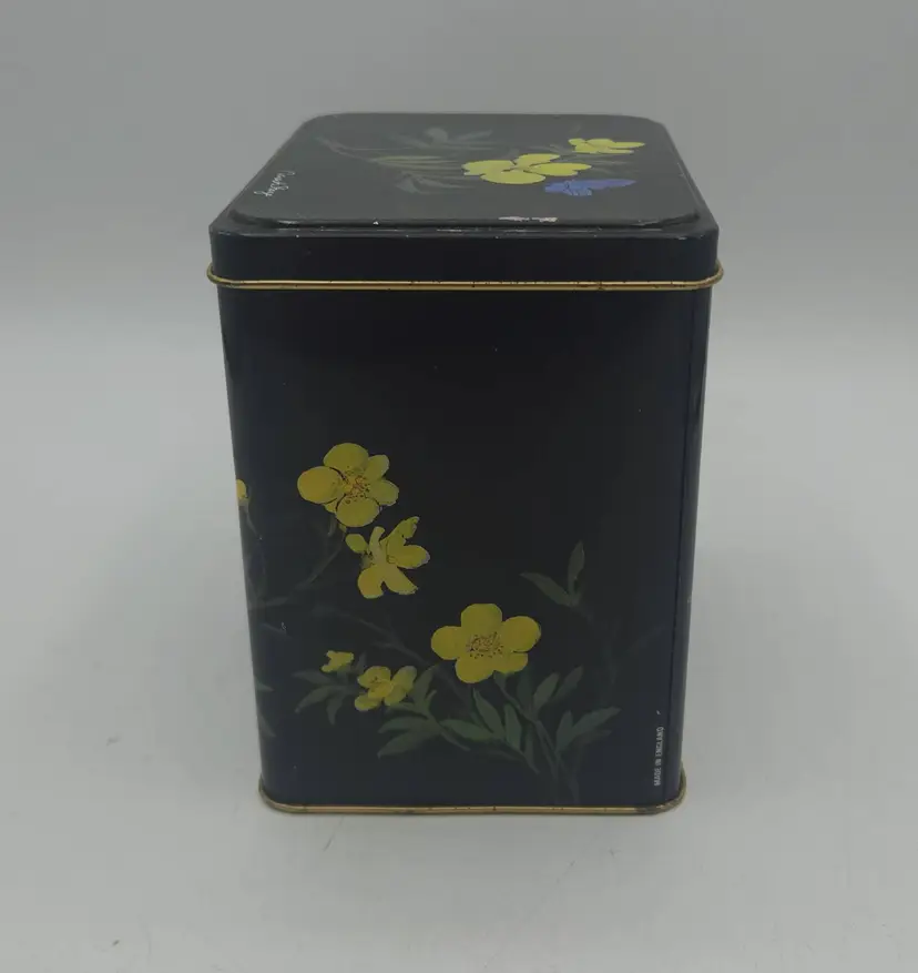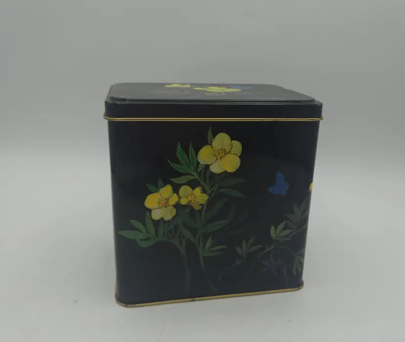 ENGLISH CANDY TIN Mads Stage Butterfly Tin Candy Box. Good condition. It is 4.75" tall and 3.5" wide. It does have some scratches on the top edges.