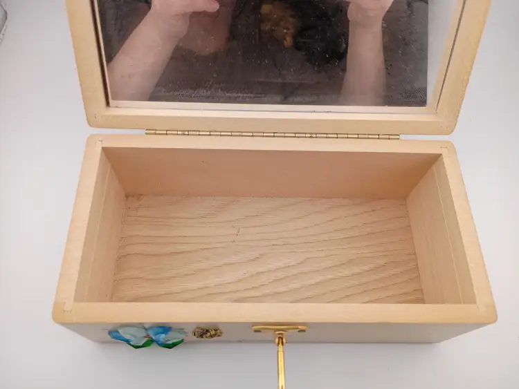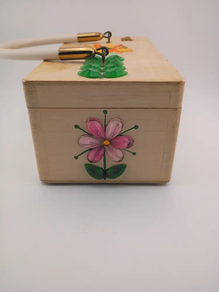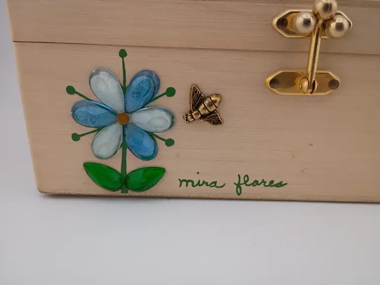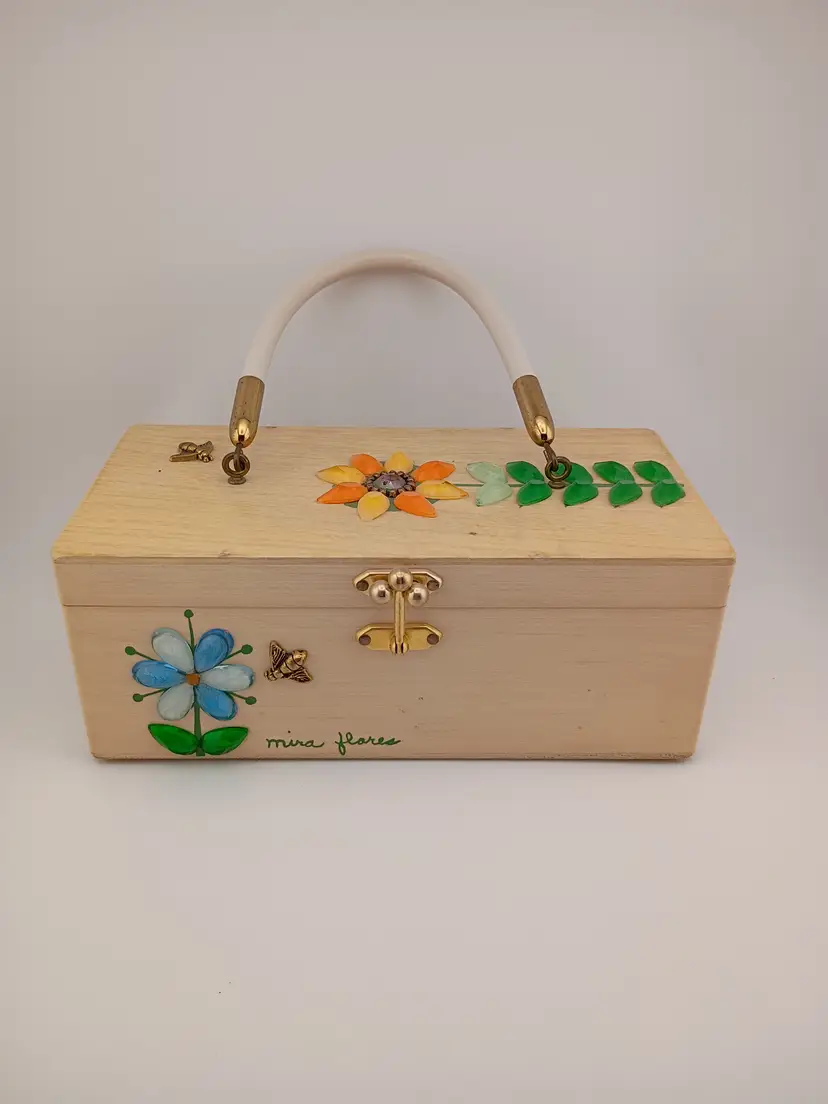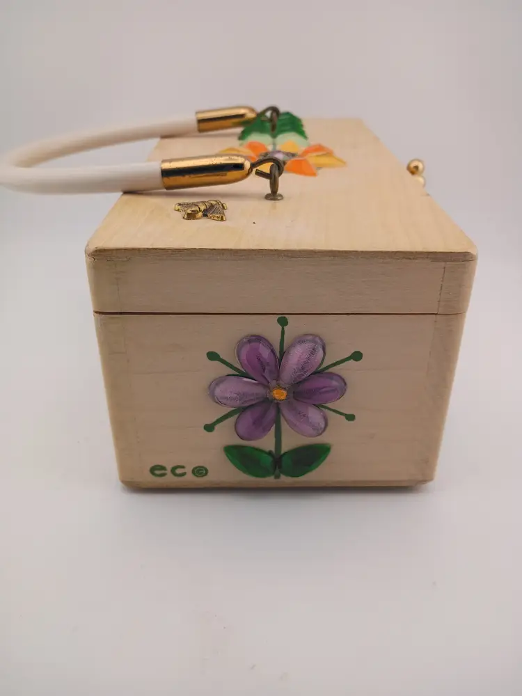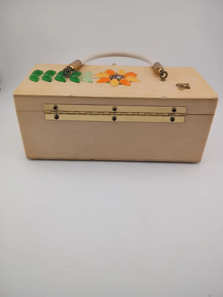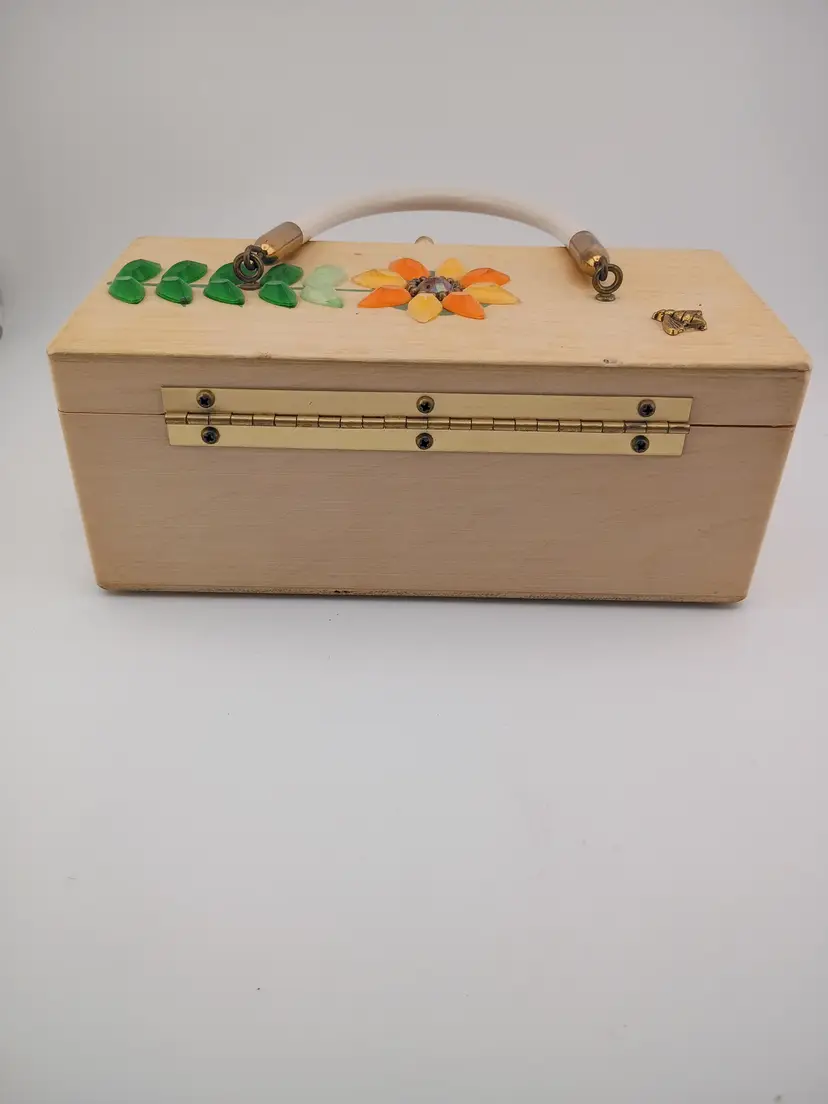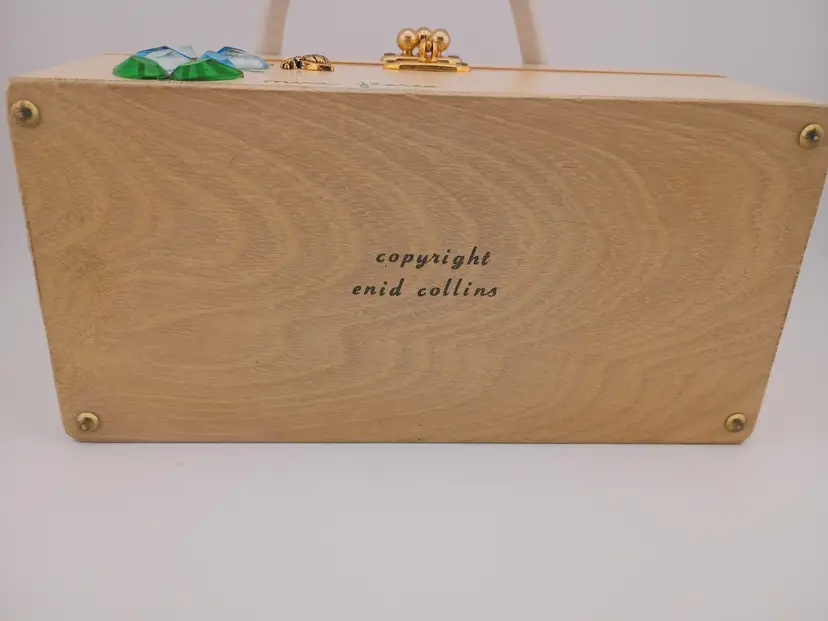 This is a fantastic signed and stamped Enid Collins box purse from the 1960s, decorated with flowers and bumblebees. It's in excellent vintage condition with no chips, crack, or missing decoration. Some of the gems have a little cloudiness. 8.75" long, 3.5" tall, 4.25" deep