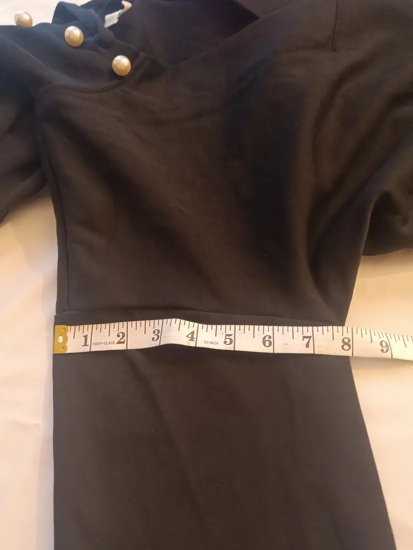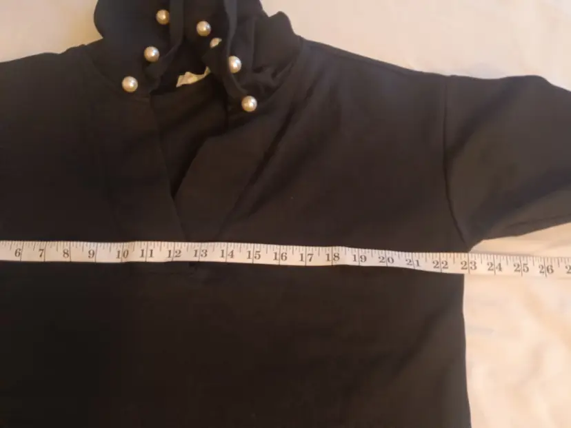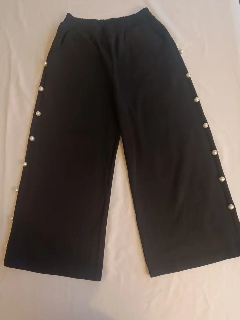 Chic black 2-piece outfit by Entro featuring pearl button accents. Includes a hoodie with pearl trim and matching wide-leg pants with pearl button sides. Soft, stretchy fabric for comfort and style. Perfect for casual wear, loungewear, or dressing up with accessories. Pre-owned, good condition.