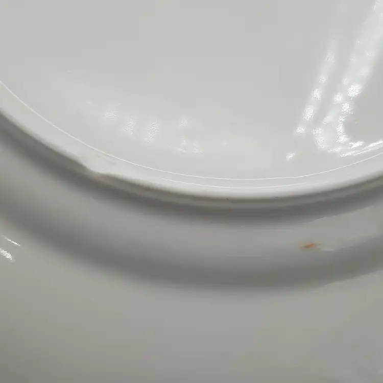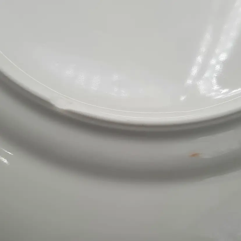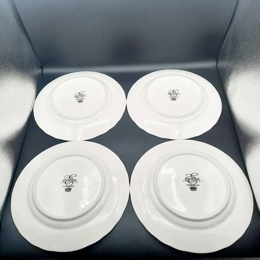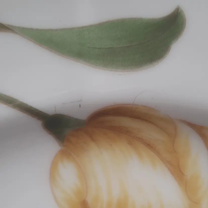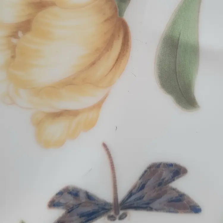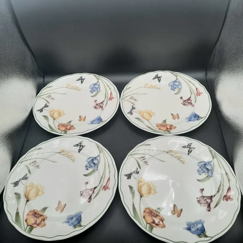 Perfect spring pattern! 10 3/4", one plate has a small chip on edge, one has chip on bottom, all have some dark scuffs/ utensil marks I have other pieces of this same pattern listed