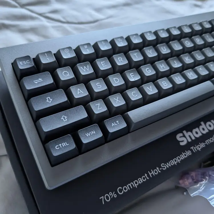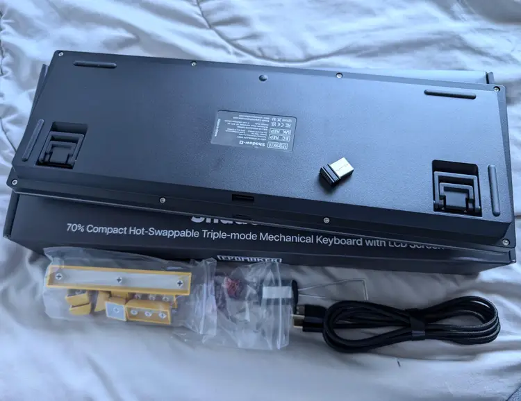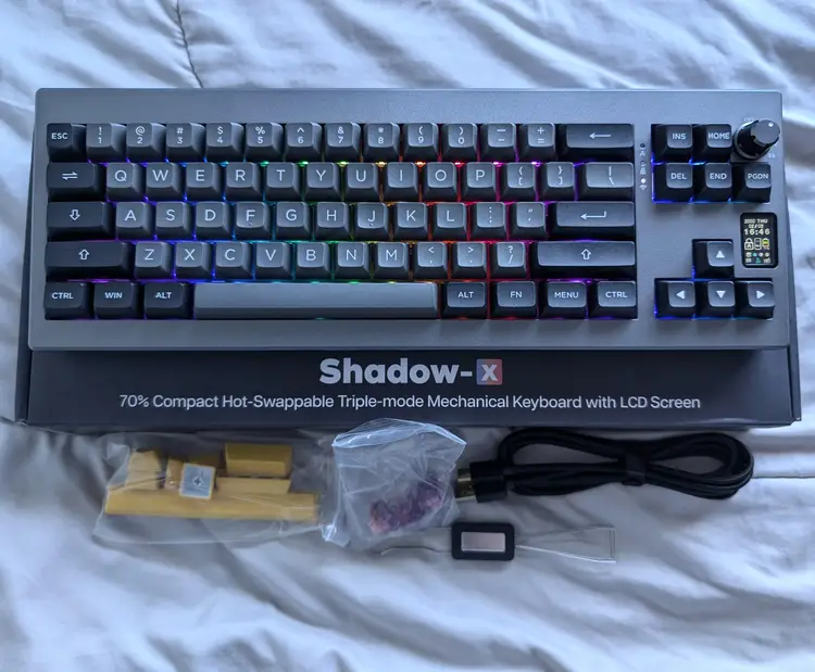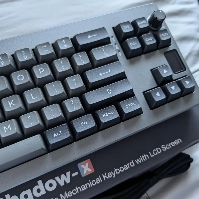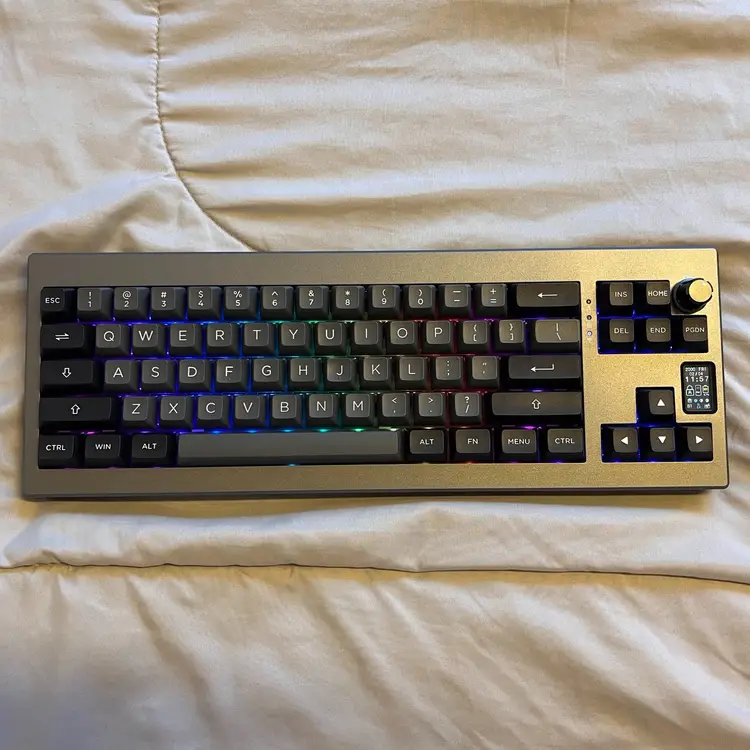 Features: 70% layout, three-mode connectivity controlled by a knob, customizable screen, south-facing switches/RGB, gasket structure.
