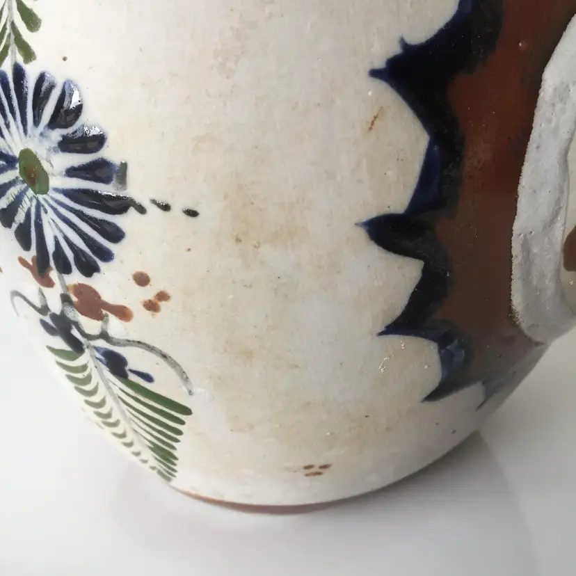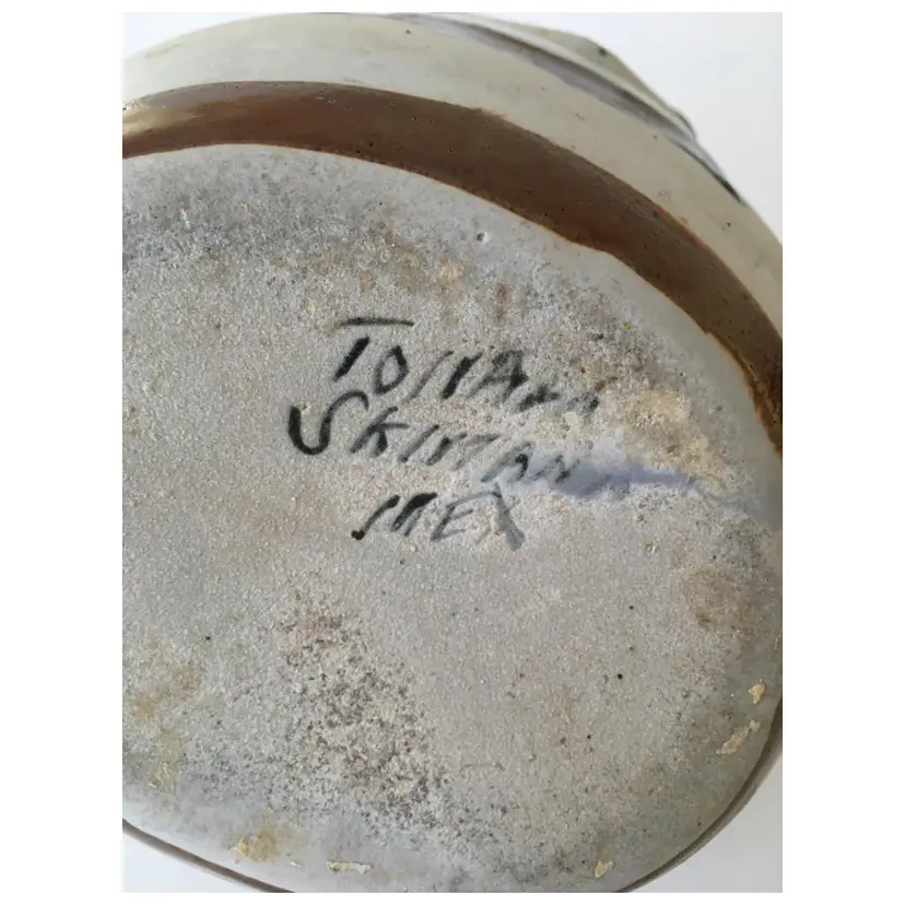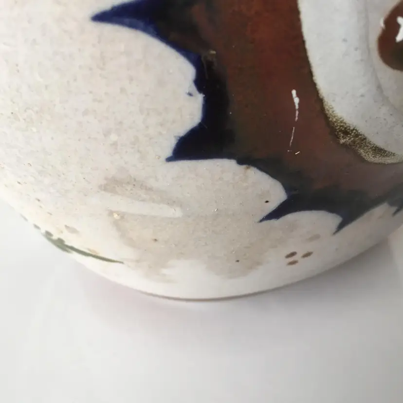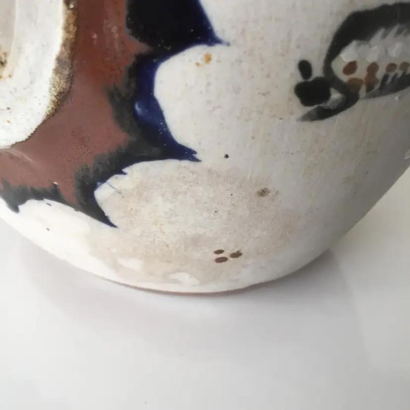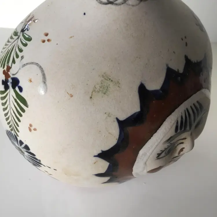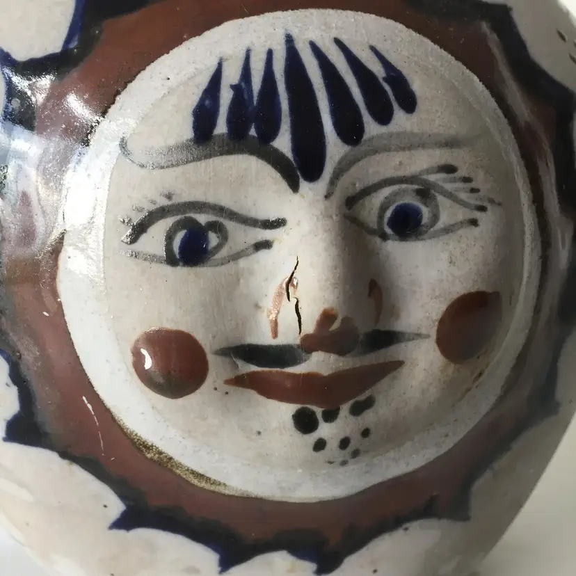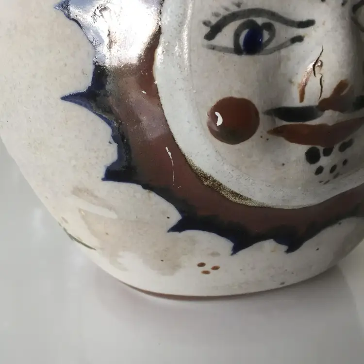 No chips. Crack in pottery at nose. A bit of staining.