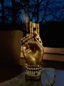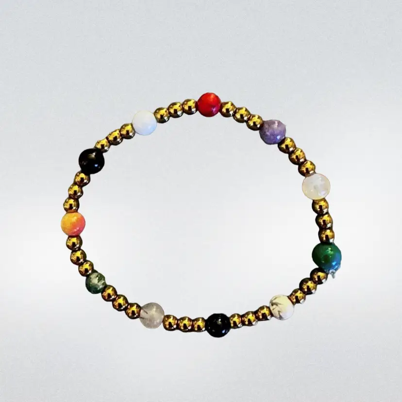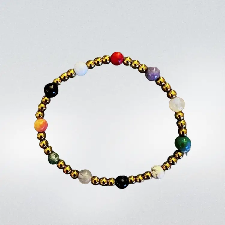 Each Era is represented by its own unique gemstone separated by pyrite Debut: Chrysocolla Fearless: Gold Rutilated Quartz Speak Now: Purple Chalcedony Red: Red Turquoise 1989: Aquamarine Reputation: Golden Obsidian Lover: Pink and Yellow Jade Folklore: Green Grass Agate Evermore: Black Rutilated Quartz Midnights: Blue Sandstone TTPD: Howlite