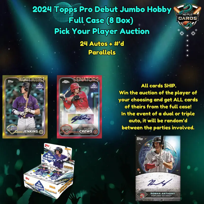 You are bidding on all the cards of the player listed in the title in this Jumbo Case (8x Boxes) of 2024 Topps Pro Debut Baseball Cards. Case will be opened LIVE after auctions end on 9/10/24. Opening will be viewable & simulcast on CardKulture as well as YouTube, Twitch, Instagram, TikTok and Twitter. US Shipping is $5.99 for your first auction spot won; each spot after that is $0.25! Any spot won where no cards of the player are found in the box will receive a bonus card. Any multi-player base cards will be split as fairly as possible between the spots of the players depicted on the card. Any hit pulled (Buybacks, Sketches, Hidden Gems etc) of a player who is NOT listed in the auction will be assigned by draw between all participants. Any dual or multi-player #'d or auto cards featuring multiple players will be assigned live between the spots depicted on the card.