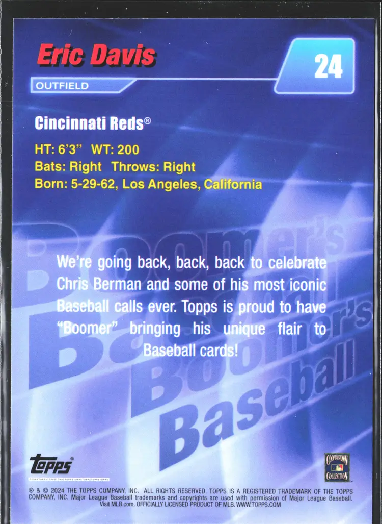 1st time buyer? Get $5 Off with code DISTRICT5 at checkout! Card as shown. All cards $20 and under ship PWE via lettertrackpro [https://www.letter-track.com/registerap.asp?AFID=8757] Team: Cincinnati Reds Sport: Baseball Manufacturer: Topps Type: Sports Trading Card Parallel/Variety: Gold Player/Athlete: Eric Davis, Chris Davis Autographed: No League: Major League (MLB) Material: Card Stock Year Manufactured: 2024 Original/Licensed Reprint: Original Vintage: No Graded: No Autograph Authentication: Topps Features: Parallel/Variety Country/Region of Manufacture: United States Season: 2024 Set: 2024 Topps x Chris Berman Boomer's Baseball