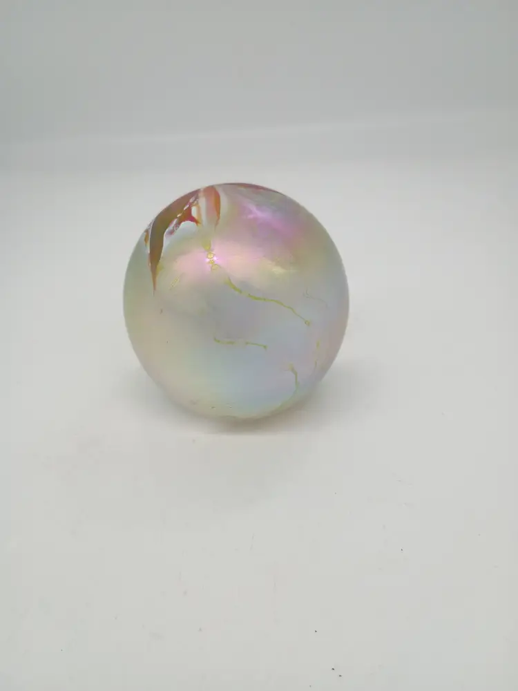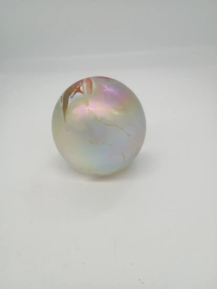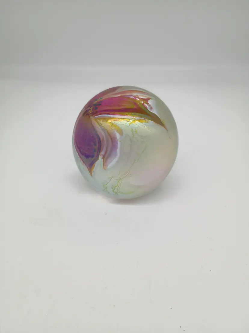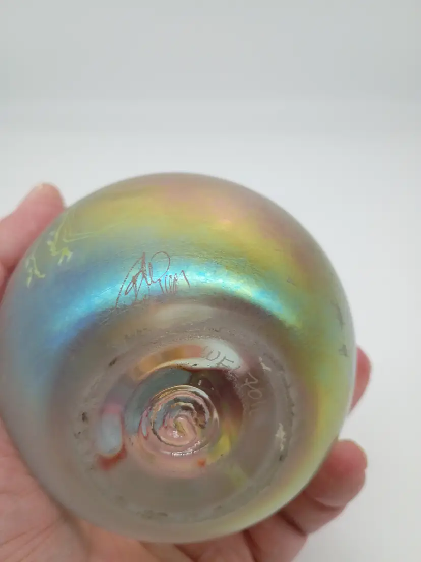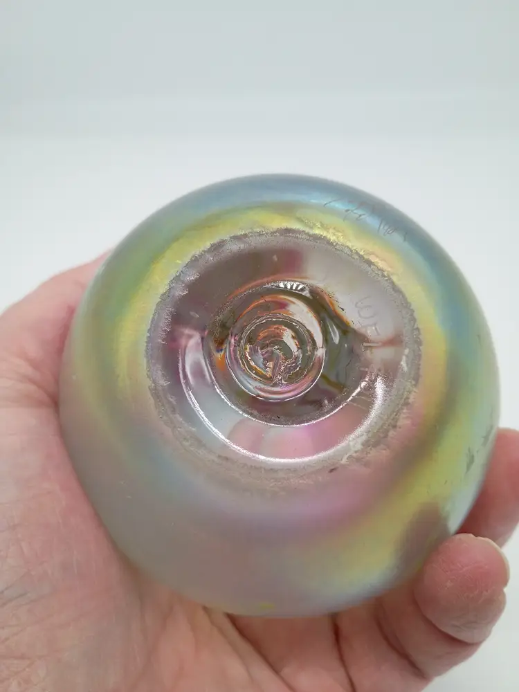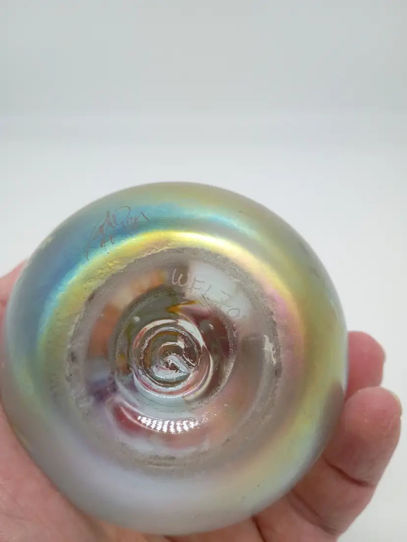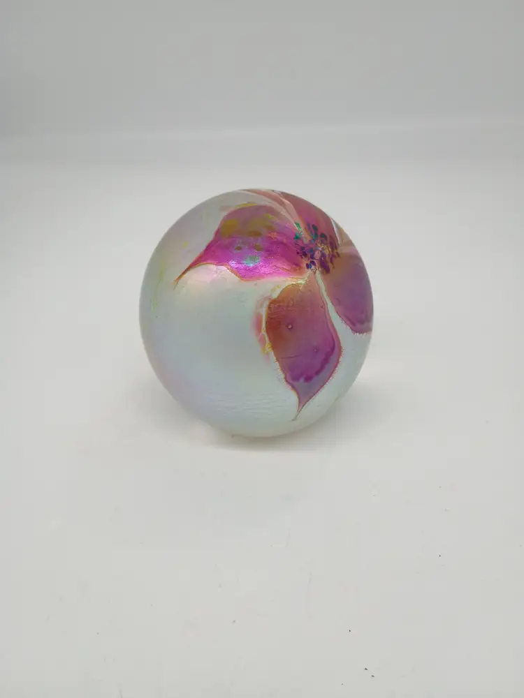 Eric Pedar Brakken Signed Seattle Glasshouse Studio Flower Iridescent Paperweight.This is the larger 3.5 inch diameter version of this design. It is solid heavy 2 lbs of glass. This is preowned. No Chips Cracks or Flea Bites, No Bruises or internal fractures. This is signed on bottom edge numbered and studio marked on bottom near pontil. Near Mint condition. Circa mid to late 1980's. Ships USPS domestically and UPS/ USPS International Shipping globally