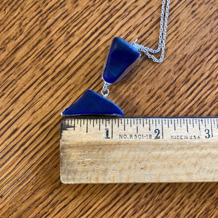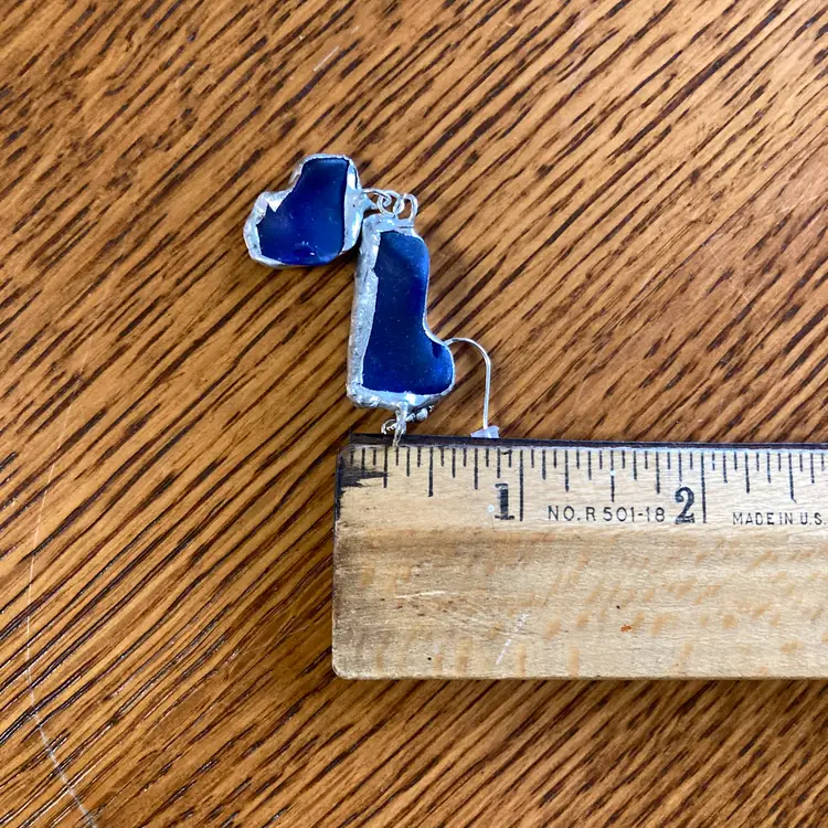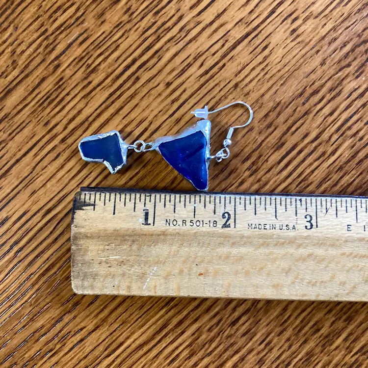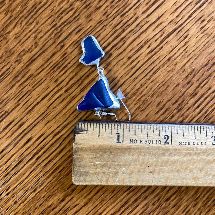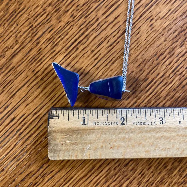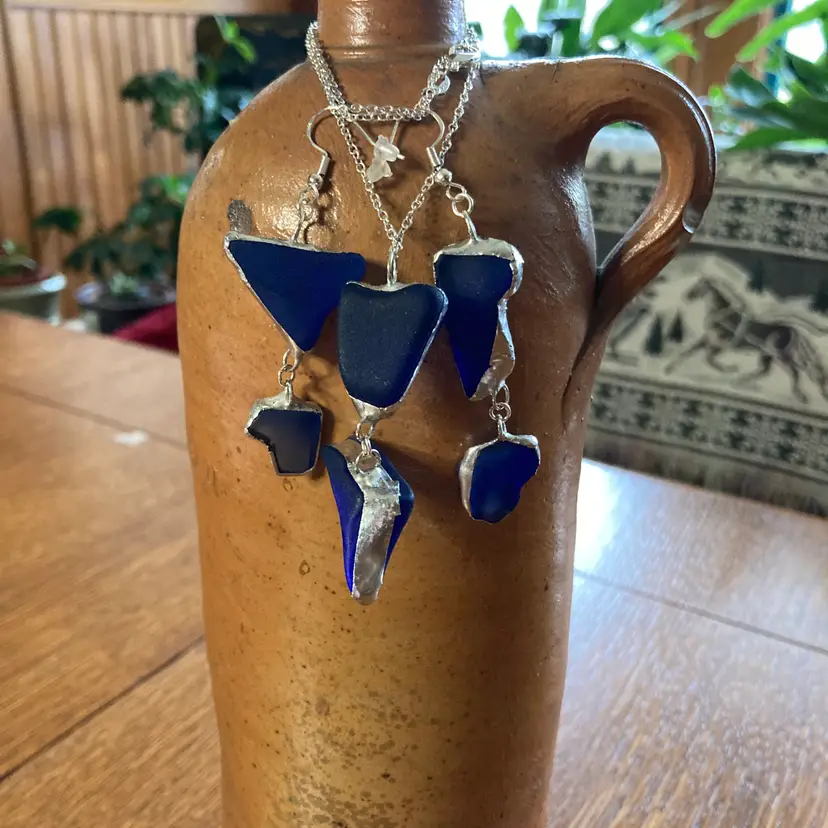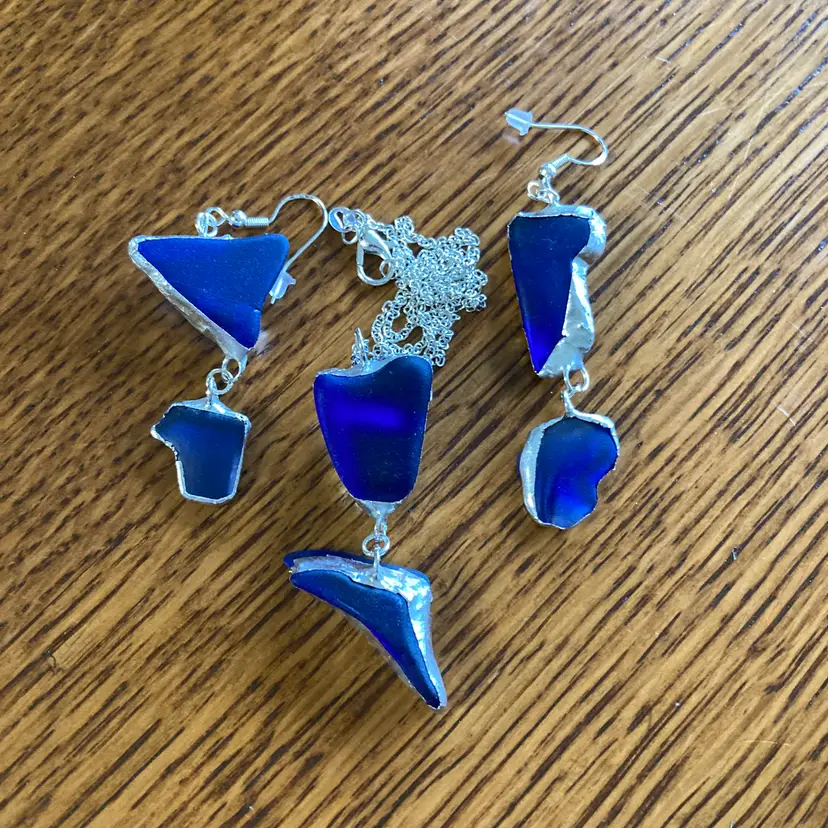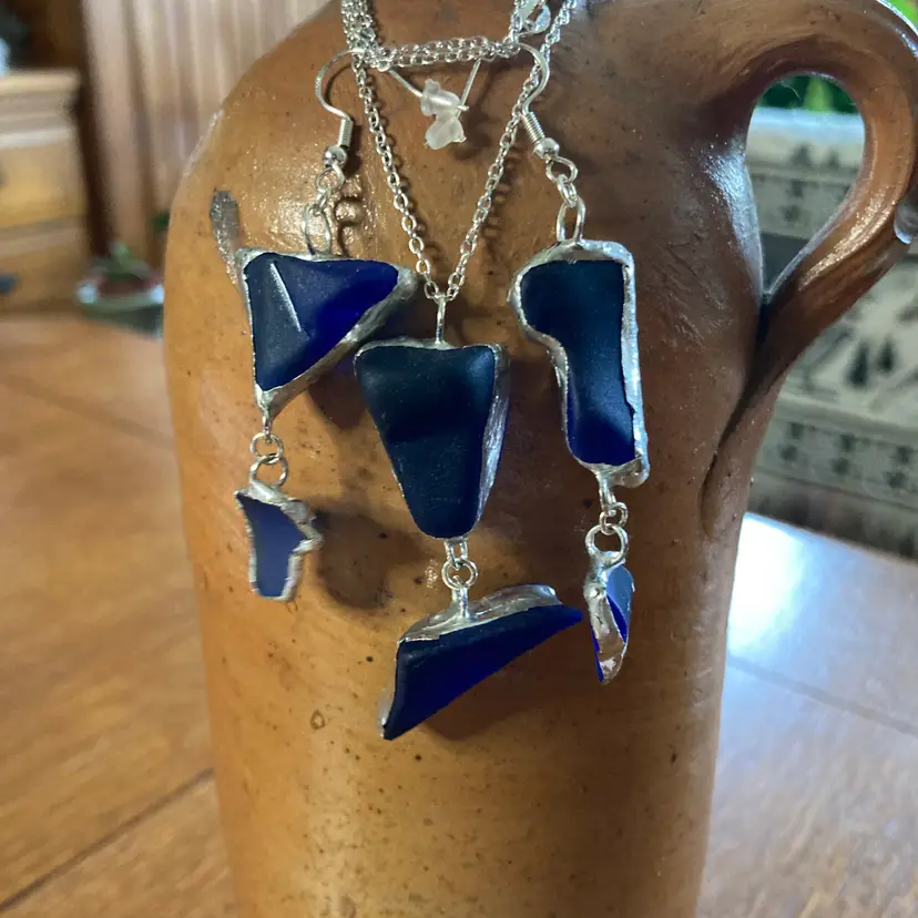 Whispers of the deep captured in glass. This handcrafted pendant and earring set emerges from the artisan's studio shrouded in cobalt mystery. Each piece a secret waiting to be worn. The blue glass catches light like water holding moonlight, shifting between shadows and luminescence with every movement. Who crafted these? What inspired their form? The answers live only in the hands that shaped them and the heart that chooses to wear them. A set for those drawn to beauty.
