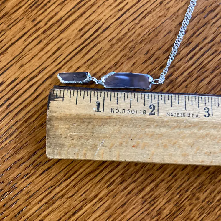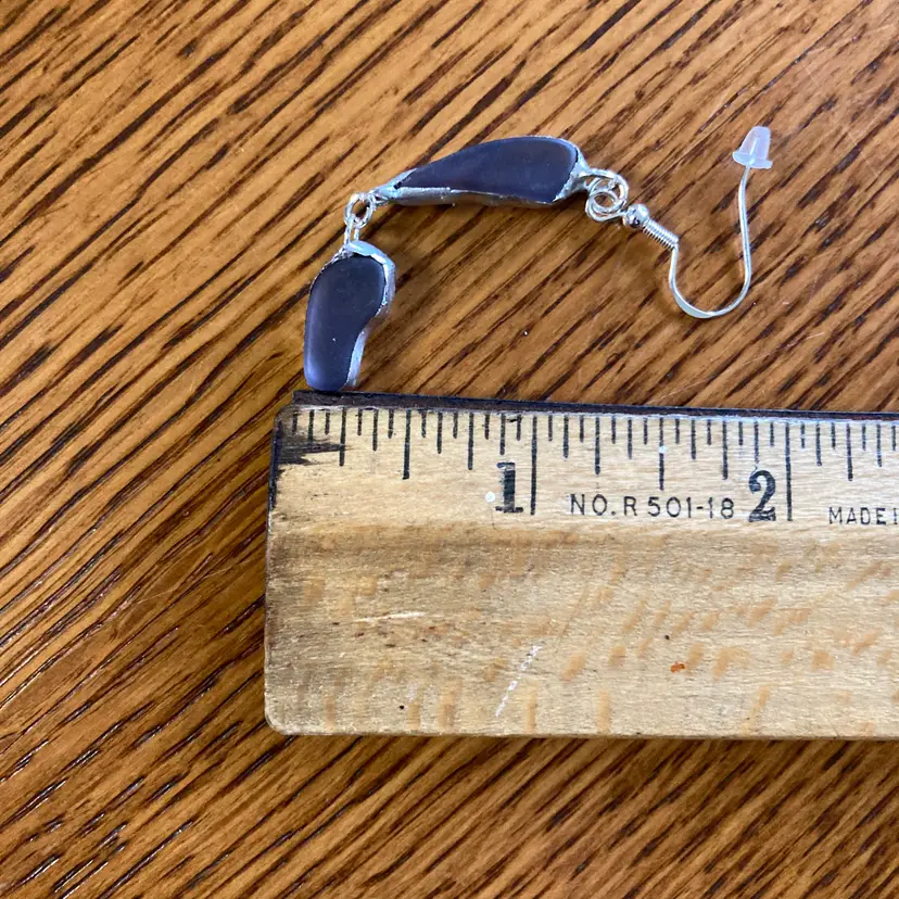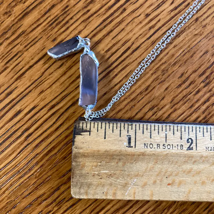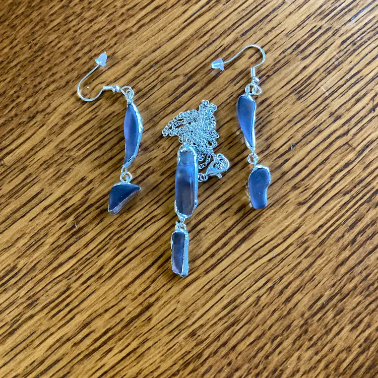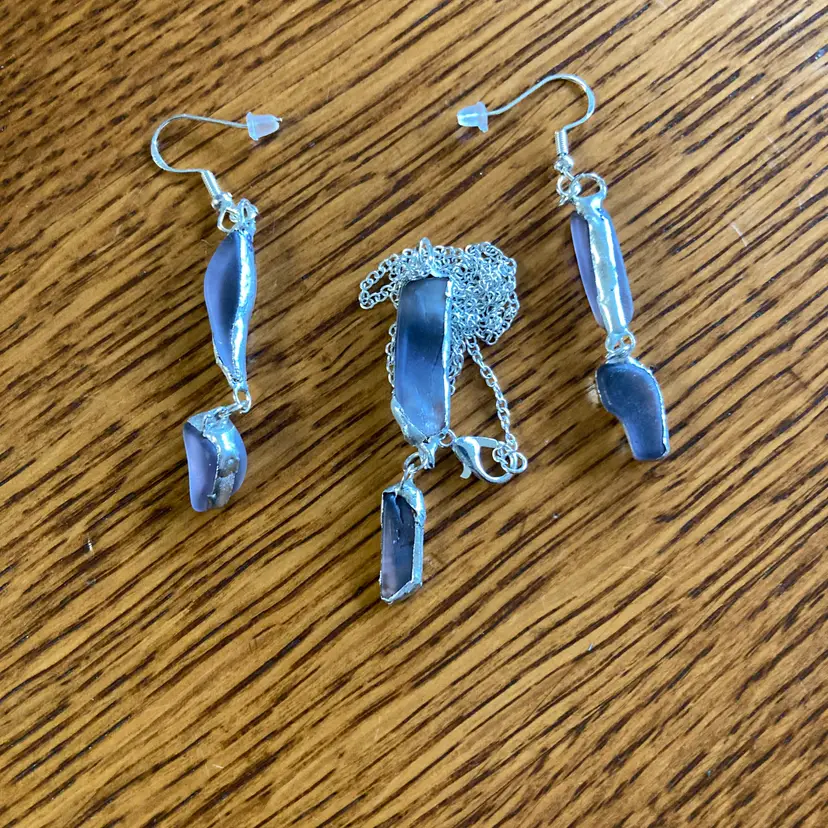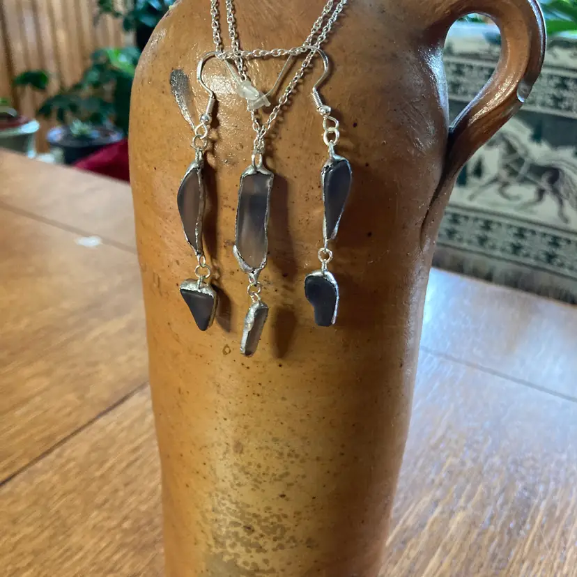A whisper of amethyst light catches your eye—but what lies beneath? This handcrafted pendant and earring set emerges from the artisan's studio shrouded in intrigue. Purple Erie glass, holds secrets in its depths. The pendant dangles with quiet mystery, while matching earrings frame your face. What draws you to it? The color? The weight? The way light bends through the glass? Perhaps it's the question itself—why does something so simple feel so compelling? Wear it and discover what others see when they ask.